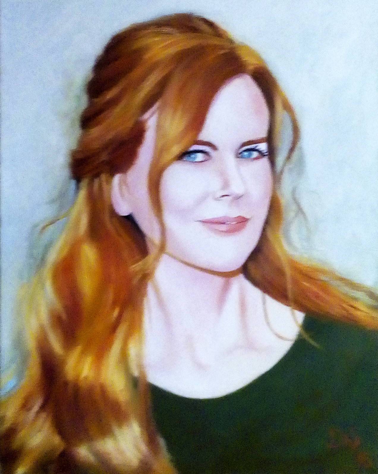 Na obrazie widzimy postać kobiety o rudych włosach, które luźno opadają na ramiona, tworząc dynamiczną grę kolorów i kształtów. Jej oczy, intensywnie błękitne, zdają się patrzeć z lekkim uśmiechem. Tło jest stonowane, co pozwala skupić uwagę na twarzy postaci i jej wyrazistej ekspresji. Atmosfera obrazu jest ciepła i przyjazna, niemal zapraszająca do rozmowy. Artysta zastosował delikatną technikę malarską, łącząc płynne linie z subtelną grą światła i cienia, co nadaje obrazowi realistyczny charakter z nutą impresji. Czujesz, jakby portret opowiadał historię, nieco tajemniczą, ale pełną serdeczności. Jest w tym obrazie coś, co sprawia, że się uśmiechasz, może to przez ten "sparkle" w oczach. Wywołuje on skojarzenia z chwilami pełnymi ciepła. Jakby ktoś z rodziny opowiadał ciekawą historię przy kominku. Ja myślę, że ta pani ma sekret, taki sekret, którego chceś się dowiedzieć, ale ona nie mówi. Dziecko powiedziałoby: "Mama, ona ma magiczne włosy!". Kombinacja techniki oraz emocji, które obraz przekazuje, jest niesamowitym doświadczeniem dla oka i serca.
