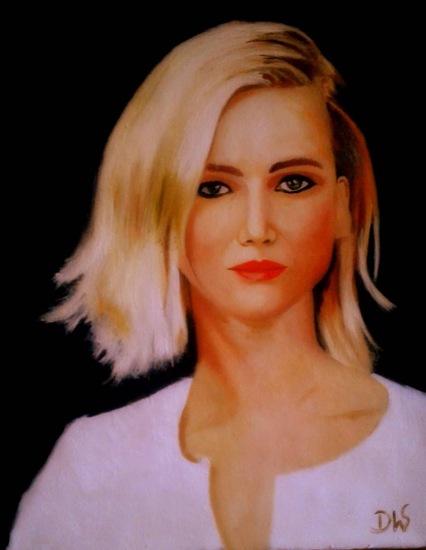 Obraz przedstawia portret kobiety, której twarz otacza aura pewnej tajemniczości. Tło jest czarne, co dodatkowo podkreśla jasne pasma włosów i delikatne rysy twarzy modelki. Dominują tu ciepłe odcienie skóry, przeplatane subtelnymi cieniami, które dodają głębii i realizmu. Artysta zastosował miękkie pociągnięcia pędzla, tworząc płynne przejścia między kolorami. Nastrój można określić jako introspektywny, a spojrzenie kobiety zdaje się sięgać w głąb naszego jestestwa. Styl obrazu jest realistyczny z nutką impresjonizmu. Finezja detali, szczególnie w rysach twarzy i włosach, pokazuje wprawną rękę artysty. Widz może dostrzec, że twórca eksperymentuje z grą światła i cienia dla uzyskania efektu trójwymiarowości. Obraz emanuje spokojem, ale jednocześnie pobudza do refleksji. Patrząc na niego, można poczuć falę ciepłych emocji i pewną nostalgię. Dziecko mogłoby powiedzieć: "Ta pani wygląda, jakby myślała o wakacjach". Dzieło z miejsca przyciąga wzrok i zatrzymuje na dłuższą chwilę. Czyż nie jest fascynujące, jak prosta kompozycja może być "mesmerizing"? To kolejny dowód na to, jak potęga sztuki potrafi poruszać nasze skryte uczucia.