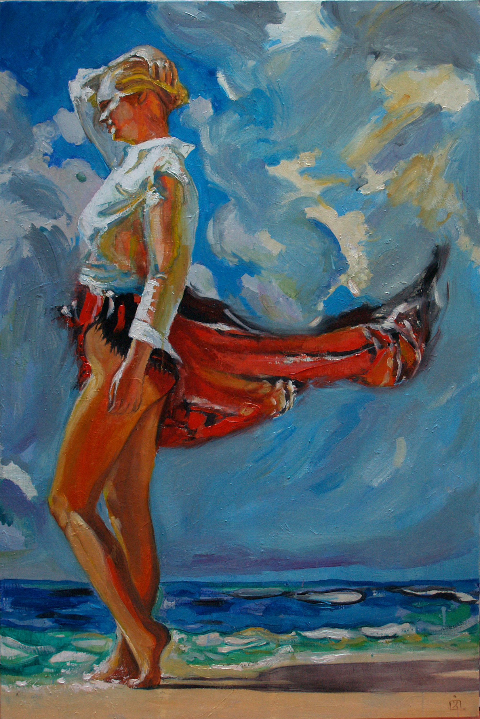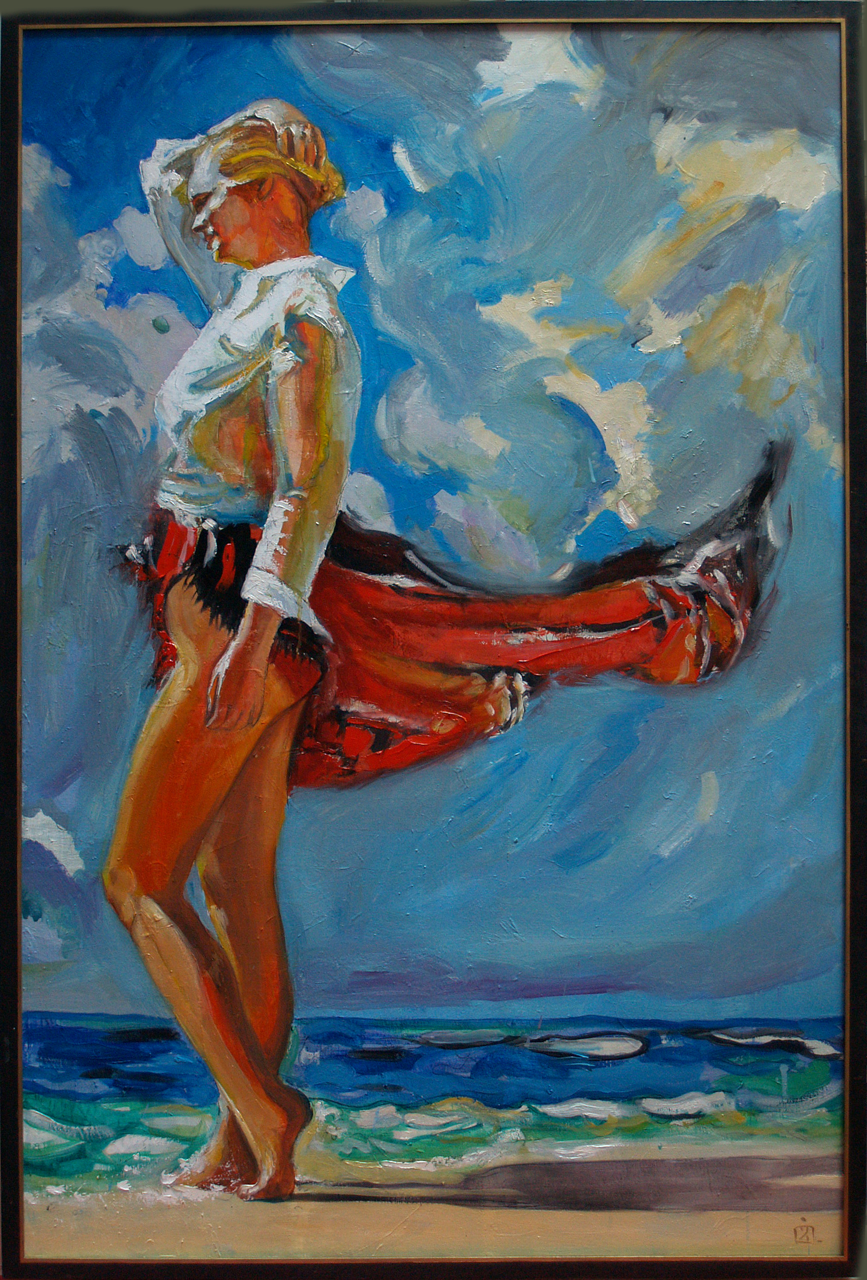Obraz ukazuje postać stojącą na plaży w wietrzny dzień, co wyraźnie widać po rozwianej, czerwonej sukni, która zdaje się tańczyć na wietrze. Kolory są intensywne, z przewagą niebieskości i bieli na niebie, co buduje poczucie przestrzeni i swobody. Słońce rzuca ciepłe, żółtawe światło na postać, podkreślając jej sylwetkę i tworząc kontrast z chłodnymi tonami morza. To prawdziwy "wow" moment artystyczny. Kompozycja jest dynamiczna, pomimo statycznej pozy bohaterki, co daje poczucie ruchu i energii. Atmosfera obrazu jest pełna beztroski i radości życia. Można poczuć delikatny powiew wiatru i usłyszeć szum fal. Styl pracy nawiązuje do impresjonizmu z widocznymi, ekspresyjnymi pociągnięciami pędzla, które dodają dziełu emocjonalną głębię. Malarska technika, z żywą paletą i dynamicznymi pociągnięciami, świetnie oddaje ulotność chwili. Dzieło może budzić w odbiorcy uczucie nostalgii za beztroskim dzieciństwem czy wakacyjnymi wspomnieniami. Ja też kiedyś byłem na plaży i bawiłem się w piasku! Taki widok może skłonić do refleksji nad pięknem chwil, które przemijają w mgnieniu oka. In English, it's like capturing a "moment in time" pełen lekkości i marzeń. Praca zmusza do zatrzymania się, chociaż na chwilę, by docenić chwilę obecności w codziennym chaosie świata. Bez nadmiernej prawidłowości, obraz urzeka swą autentycznością, mieszając techniczne mistrzostwo z czystym wyrazem emocji.