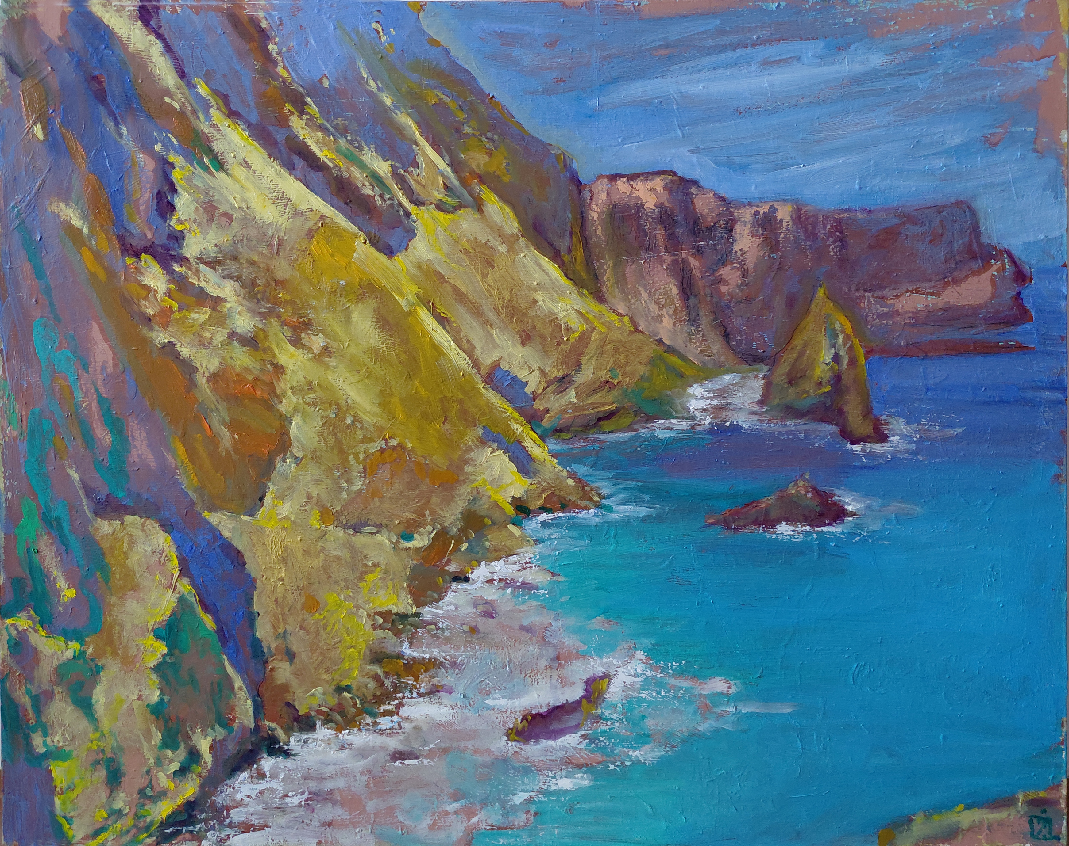 Na obrazie widać urwiste klify schodzące do morza, ułożone po skosie od lewego brzegu aż w głąb kadru. Skały są malowane grubą farbą w żółciach, ochrach, fioletach i zielonkawych smugach, jakby światło raz grzało, a raz chowało się w cieniu. Woda ma turkus i głęboki błękit, a biała piana rozrywa linię brzegu na poszarpane plamy. Niebo jest spokojne, chłodne, szerokie, i robi całą tę scenę bardziej epic. To wygląda jak szybki impast, pociągnięcia pędzla są widoczne i troche szorstkie. Czuję wiatr i taką samotność, ale też ulgę, bo to miejsce oddycha. To jest fajne morze. Można tu czytać o czasie, który ściera kamień, i o nas, co też sie kruszymy, no cóż.