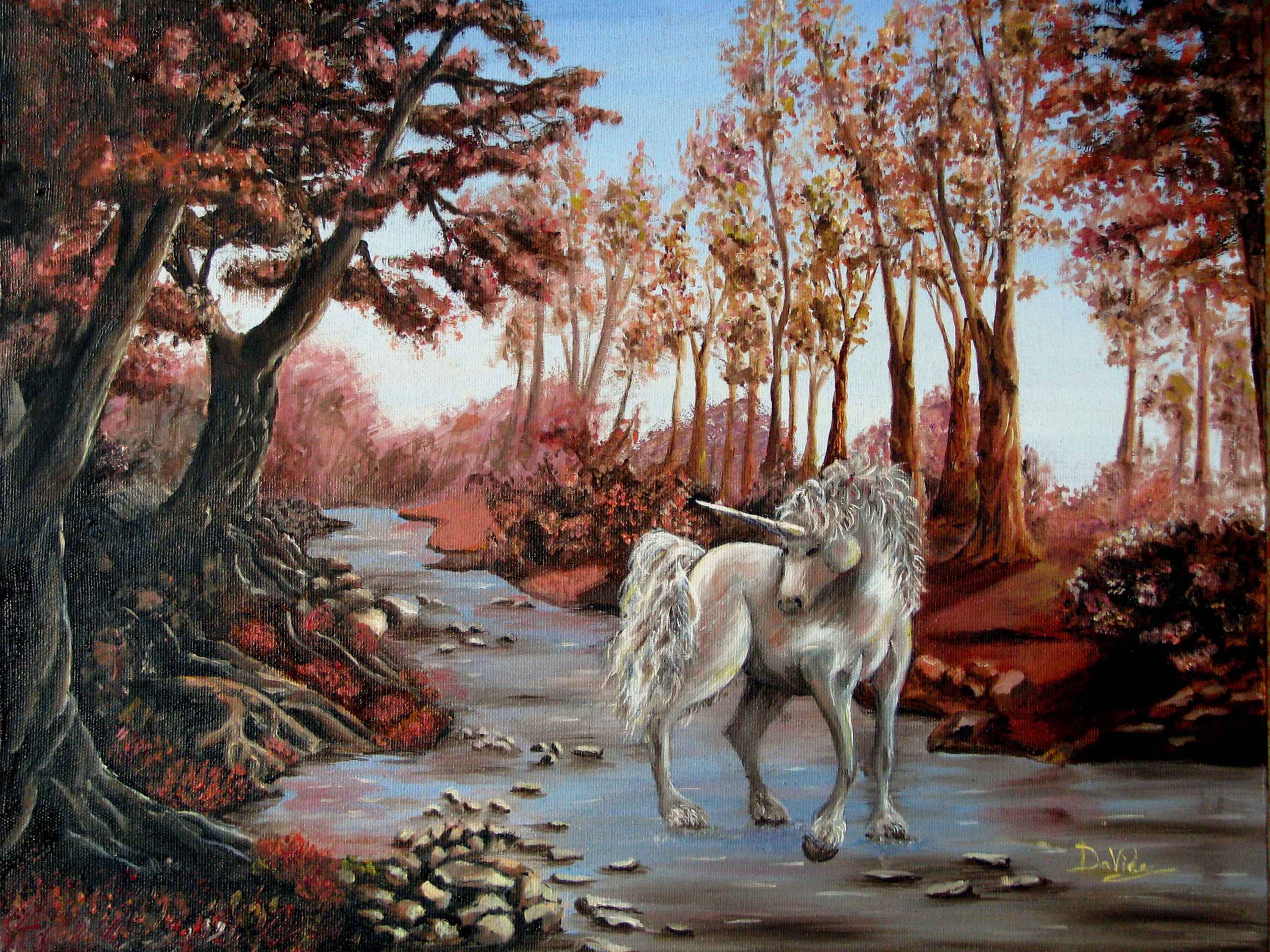 Obraz przedstawia magiczną scenę, w której biały jednorożec stoi nad błyszczącym strumykiem otoczonym przez drzewa w odcieniach czerwieni i pomarańczu. Kolory na płótnie przypominają jesienną paletę: liście zdają się płonąć w słońcu. Kompozycja jest harmonijna, z jednorożcem jako centralnym punktem przyciągającym wzrok. Nastrój obrazu jest pełen spokoju i magii; to miejsce, gdzie rodzą się bajki. Styl artysty nawiązuje do realizmu, ale z nutą fantazji, co dodaje dziełu niezwykłości. Malarskie pociągnięcia pędzla są delikatne, ale jednocześnie wyraźne, co podkreśla fakturę futra jednorożca i falującą wodę. Dzieło może wywołać u odbiorcy poczucie zachwytu i nostalgii za światem dziecięcych marzeń. "Uwaga! To magic!" - mogłoby krzyknąć dziecko, zachwycone baśniową atmosferą. Obraz, wiszący na ścianie, przypomina mi o chwilach, kiedy chciałem uciec od rzeczywistości. Jest w nim coś buddyjskiego, co skłania do refleksji. Szum strumyka zdaje się słychać, choć to tylko płótno i farba.