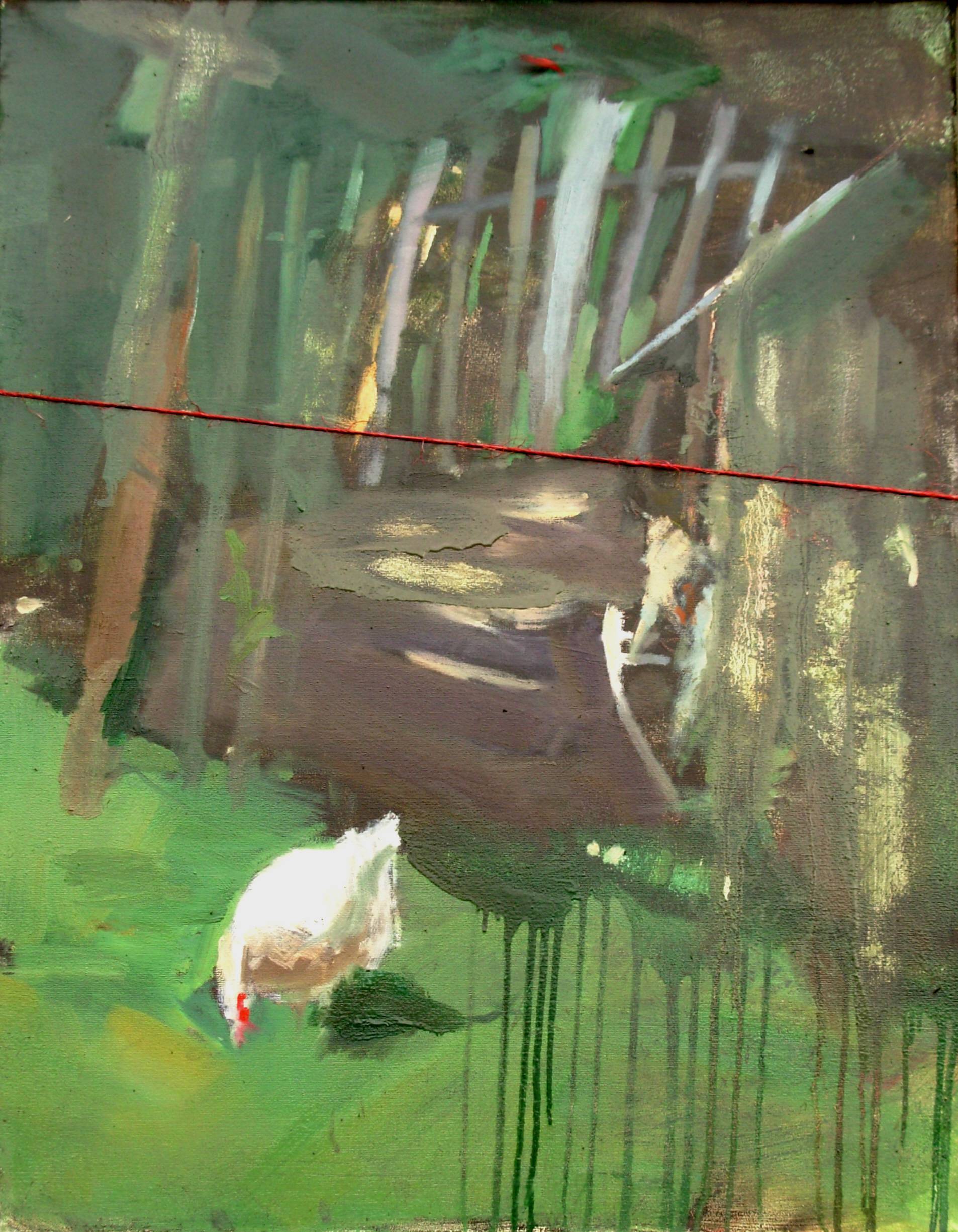 Obraz, na który patrzymy, przyciąga uwagę swoją ekspresją i kolorami. Dominują w nim odcienie zieleni, przeplatane subtelnymi tonami brązów i bieli. Kształty są zamierzenie rozmyte, co nadaje całości wrażenie lekkości i abstrakcyjności. Na pierwszym planie dostrzegamy białą kurę, której obecność kontrastuje z głęboką zielenią tła. Wygląda jakby spacerowała w spokoju, ignorując wszystko wokół. Sam obraz można by opisać jednym słowem: mysterious. Atmosfera obrazu jest sielska, a jednocześnie nieco tajemnicza. Aura lasu, przez który przechodzi czerwona linia, dodaje dziełu głębi i pewnej dynamiki. Jest w tym coś z mistyki, co naprawdę przyciąga wzrok. Czyżby to ścieżka zagubionych emocji? Może i tak. Styl artysty przywołuje na myśl impresjonizm, choć z pewnością nie jest to klasyczne odwzorowanie tego nurtu. Szczotkowanie pędzla tworzy delikatne smugi, które zdają się uciekać poza obręb płótna. Dzieło wywołuje w odbiorcy nostalgię i lekkie wspomnienie beztroskiego dzieciństwa na wsi. Patrząc na nie, można poczuć ciszę poranka i ciepły wiatr na twarzy. Gdy byłem dzieckiem, tak właśnie sobie wyobrażałem bajkowy las. Ten obraz to odrobina spokoju w chaosie codzienności.
