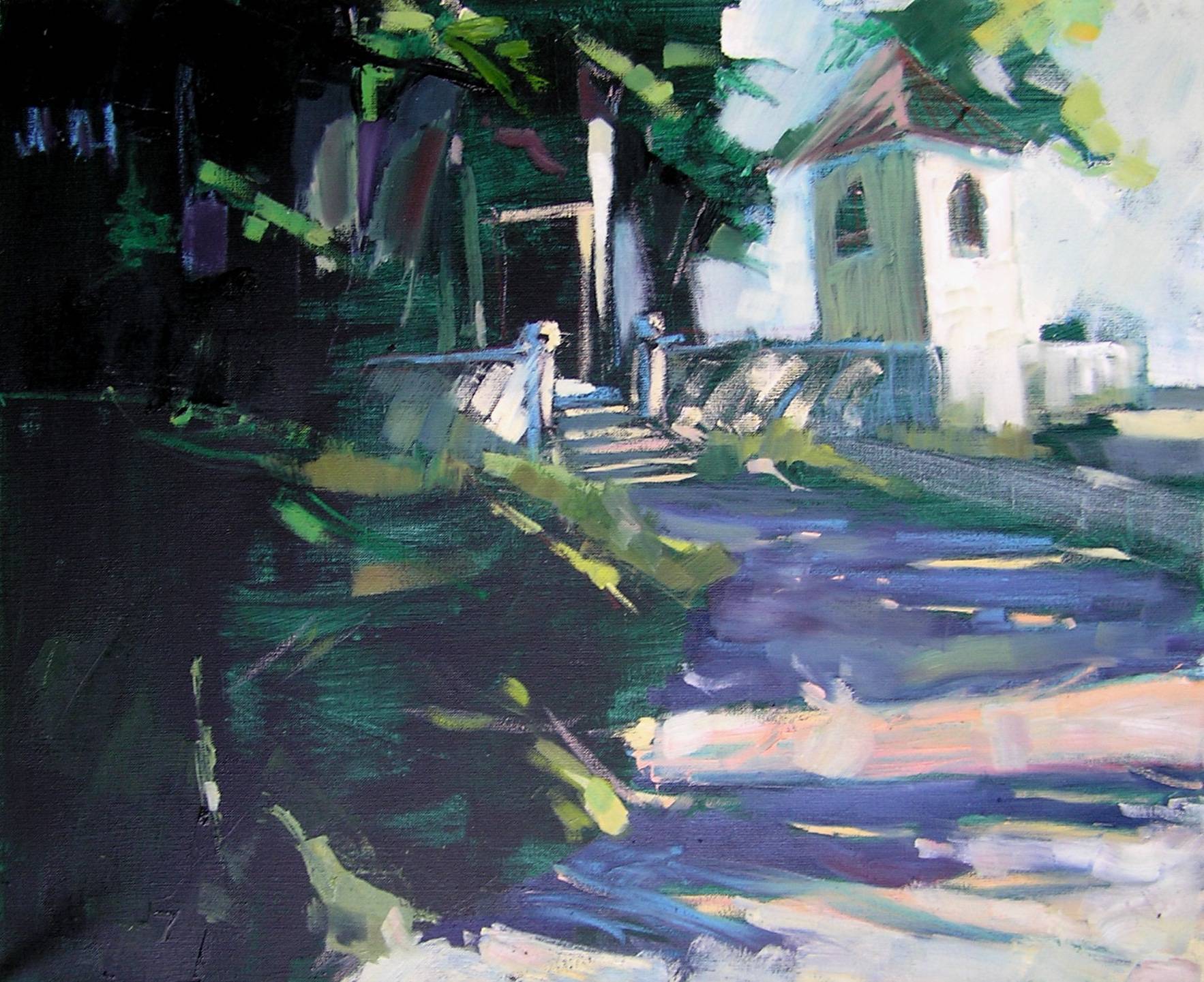 Obraz emanuje spokojem i tajemnicą, przenosząc widza w świat pełen kontrastów. Dominuje zieleń i głęboki fiolet, które kształtują obraz na malowniczy pejzaż. Krzesła zawieszone w przestrzeni, jakby czekały na bohaterów nieopowiedzianej historii. Delikatnie zaznaczone przejścia koloru dodają przestrzeni głębi. Kompozycja prowadzi wzrok ku białej wieżyczce, przypominającej oaza spokoju. Atmosfera obrazu jest nieco nostalgiczna, ale... z nutą świeżości. Jak ten zapach trawy po deszczu, kiedy już wiesz, że zaraz wyjdzie słońce. Artysta zastosował technikę impasto, co nadaje powierzchni teksturę i dynamikę. Te gęste pociągnięcia pędzla tworzą iluzję ruchu. Wpatrując się w ten obraz, można poczuć nutę tajemniczości, jakby artysta chciał powiedzieć "come closer". Może to miejsce, które przypomina dzieciństwo? Albo taki zakątek za domem babci, gdzie zawsze było co odkrywać. Wyobraź sobie, że biegniesz po tej drodze jak bohater z filmu i czujesz wiatr we włosach. To uczucie wolności i beztroski. Dzieciak by powiedział: „A tam jest magiczny domek!”. No i kto by się nie zgodził? Ktoś, kto spojrzy na ten obraz, zobaczy nie tylko krajobraz, ale i emocje ukryte w każdym pociągnięciu pędzla.