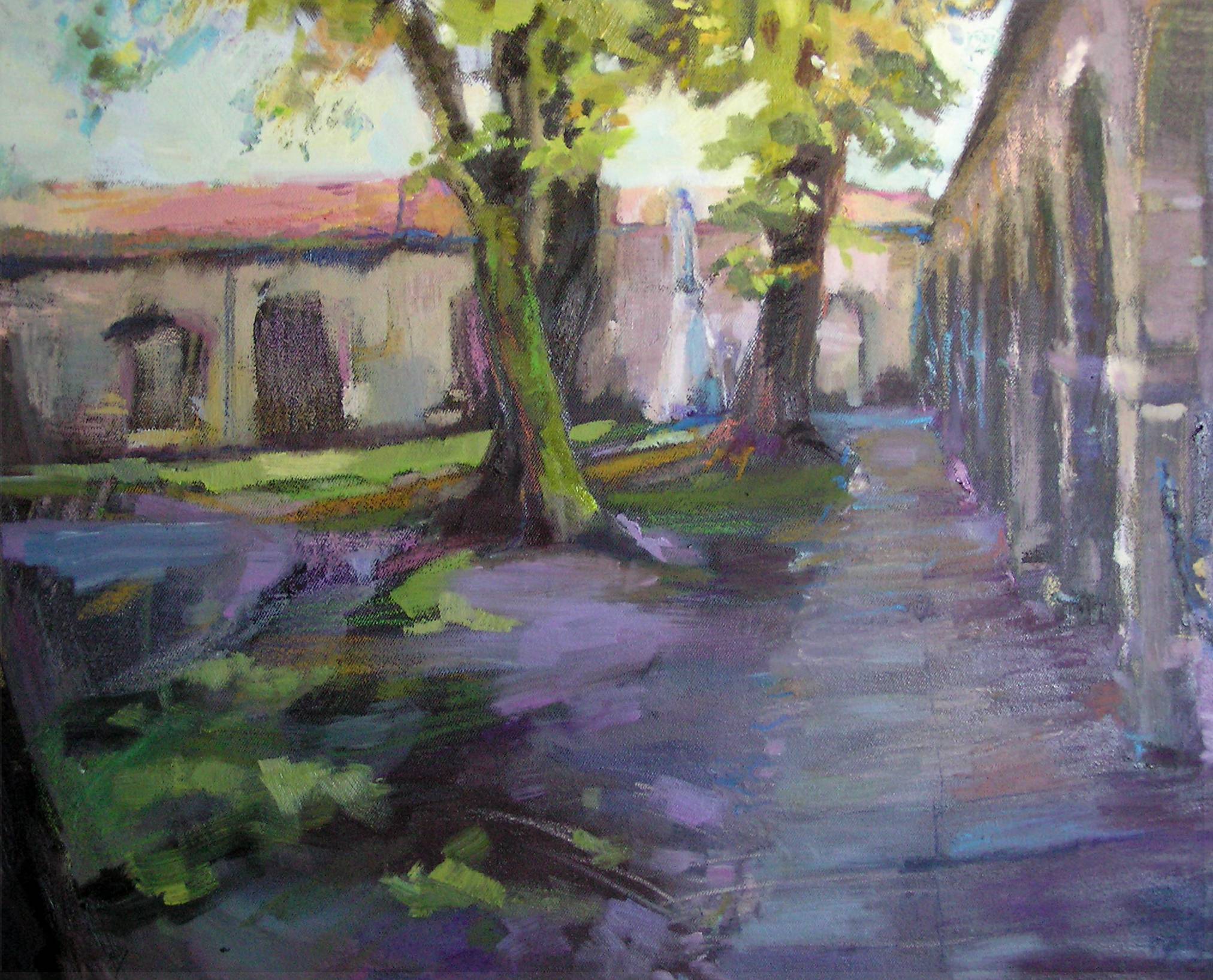 Obraz tętni kolorami, jakby ktoś rozsypał pastelowe kredki na płótno. Dominują fiolety, zielenie i delikatne odcienie różu. Centralnie widać drzewa, które rzucają długie, cieniowane smugi na kamienną drogę. Budynek po prawej stronie malowany jest w ciepłych, przytłumionych barwach, co dodaje scenie nostalgii. Atmosfera obrazu przypomina cichy, letni poranek, gdzie czas płynie wolniej. Jest w tym coś magicznego i jednocześnie znajomego, jak spacer po dawnym miasteczku. Technika impastu nadaje obrazowi fakturę, sprawiając, że każde pociągnięcie pędzla jest odczuwalne. Artysta stosuje zarówno rozmyte, jak i ostre linie, co wprowadza dynamikę i głębię. Czuć tu lekkość, jakby ktoś pstryknął palcami i voilà! — pejzaż stał się rzeczywistością. Budzi to skojarzenia z dzieciństwem, gdy każdy spacer wydawał się przygodą. Mój piesek by tu biegał i szczekał! Emocje? Nostalgia, spokój i nutka tajemnicy. Obraz jest jak ciepły koc w zimny dzień, otulający i uspokajający. Patrząc na niego, myślę o "dreams", które pojawiają się niespodziewanie, prowadząc nas inną ścieżką niż zwykle. To piękne, jak sztuka może budzić życie w zwykłych chwilach.