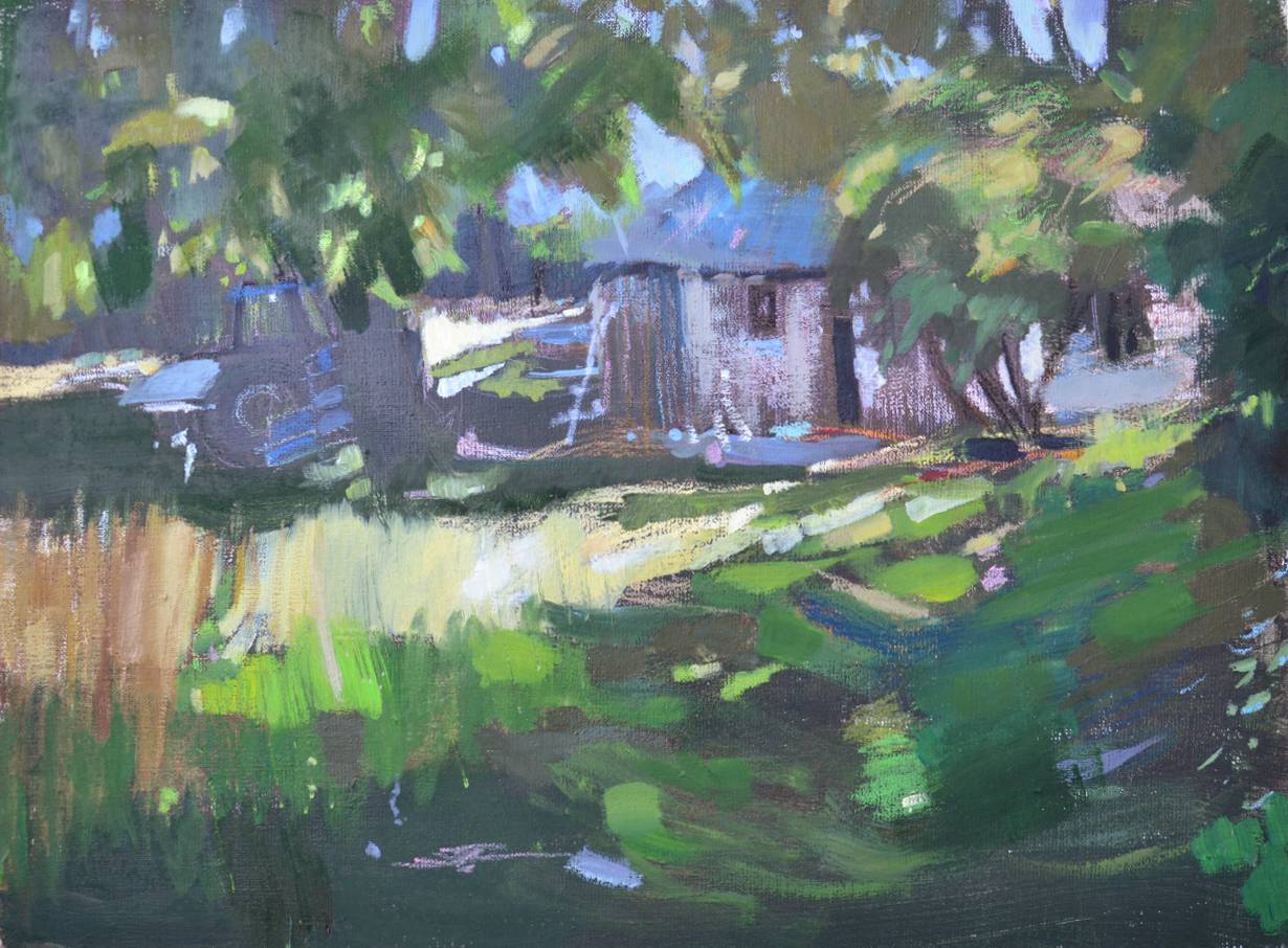 Obraz emanuje spokojem i ciepłem letniego dnia. W centrum widzimy scenkę z wiejskiego podwórka, otoczoną bujną zielenią drzew i krzewów. Zieleń dominuje na pierwszym planie, przeplatając się z subtelnymi plamami błękitów i fioletów tła. Szczegóły zacierają się w impresjonistycznym stylu. Artysta zastosował dynamiczne pociągnięcia pędzla, nadając kompozycji ruch i życie, jakby wiatr szumiał w gałęziach drzew. Jasne i ciemne plamy światła tworzą kontrast, który dodaje głębi i tajemniczości. Wow, wszystko wygląda jak w bajce! Obraz wzbudza nostalgię, przypominając o beztroskich dniach spędzonych na łonie natury. Czuje się niemal zapach trawy i ciepły dotyk słońca. Uderza nas poczucie spokoju i harmonii, które można określić jednym słowem: "serenity". To miejsce, gdzie chciałoby się zatrzymać czas i przysiąść na chwilę, by zanurzyć się w ciszy tego magicznego krajobrazu.