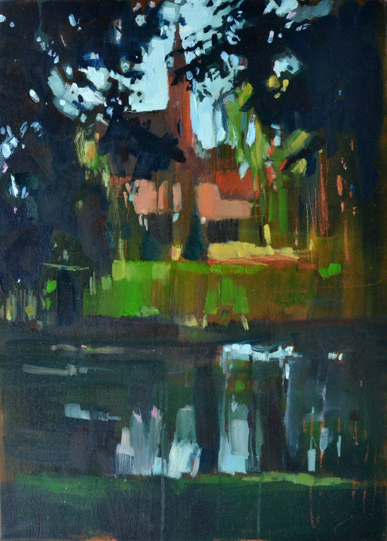 Obraz przypomina magiczną chwilę zaklętą w naturze. Dominują na nim zielenie i brązy, które nadają mu świeżości i tajemniczości. Centralny punkt obrazu tworzy zarysy budynku w ciepłych, ceglastych odcieniach. W tle widać rozmyte sylwetki drzew, które wyglądają jakby tańczyły w świetle poranka. Cała kompozycja zlewa się w harmonijną całość, tworząc niemalże impresjonistyczną wizję. Obraz może przypominać spokojne poranki nad jeziorem, kiedy świat budzi się do życia. Jest jak szept przyrody, który niesie subtelne emocje spokoju i kontemplacji. Artysta używa techniki swobodnych pociągnięć pędzla, które nadają dziełu dynamiki i ruchu. Namalowane linie są luźne, pełne ekspresji, co sprawia, że każde spojrzenie odkrywa coś nowego. Patrząc na obraz, czuć lekki powiew nostalgii. Może przywołać wspomnienia z dzieciństwa spędzonego na wsi, gdzie dzień zaczynał się od wyprawy nad wodę. Woda odbija rozmyte barwy nieba i drzew jakby pobierając "colors" z otoczenia. Ten obraz to jakby historia opowiedziana bez słów, pełna nieuchwytnych chwil. Wystarczy jedno spojrzenie, by poczuć tę subtelną mieszankę energii i spokoju. Piękny, po prostu piękny. Wyobraź sobie, jak siedzisz na brzegu, a czas zwalnia krok. To obraz, który mówi więcej niż tysiąc słów.