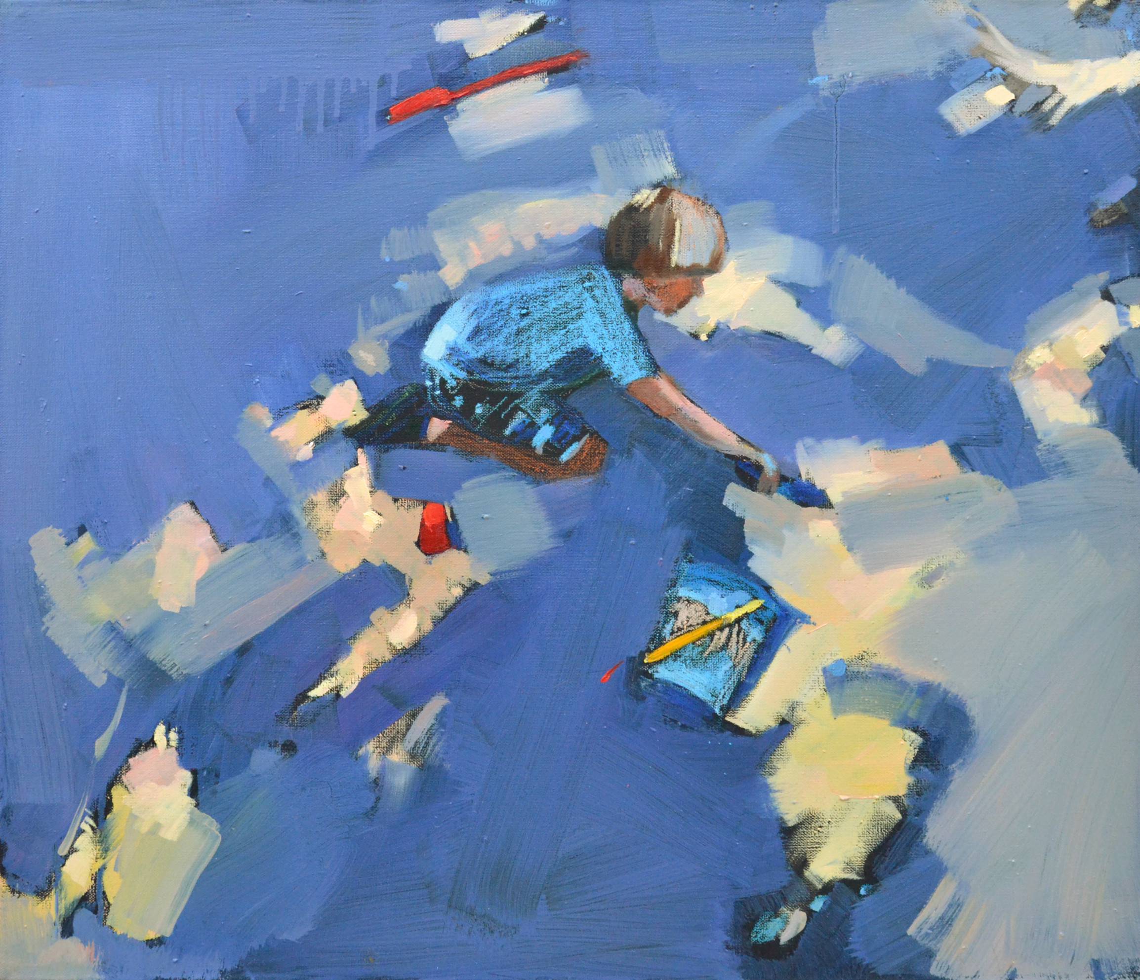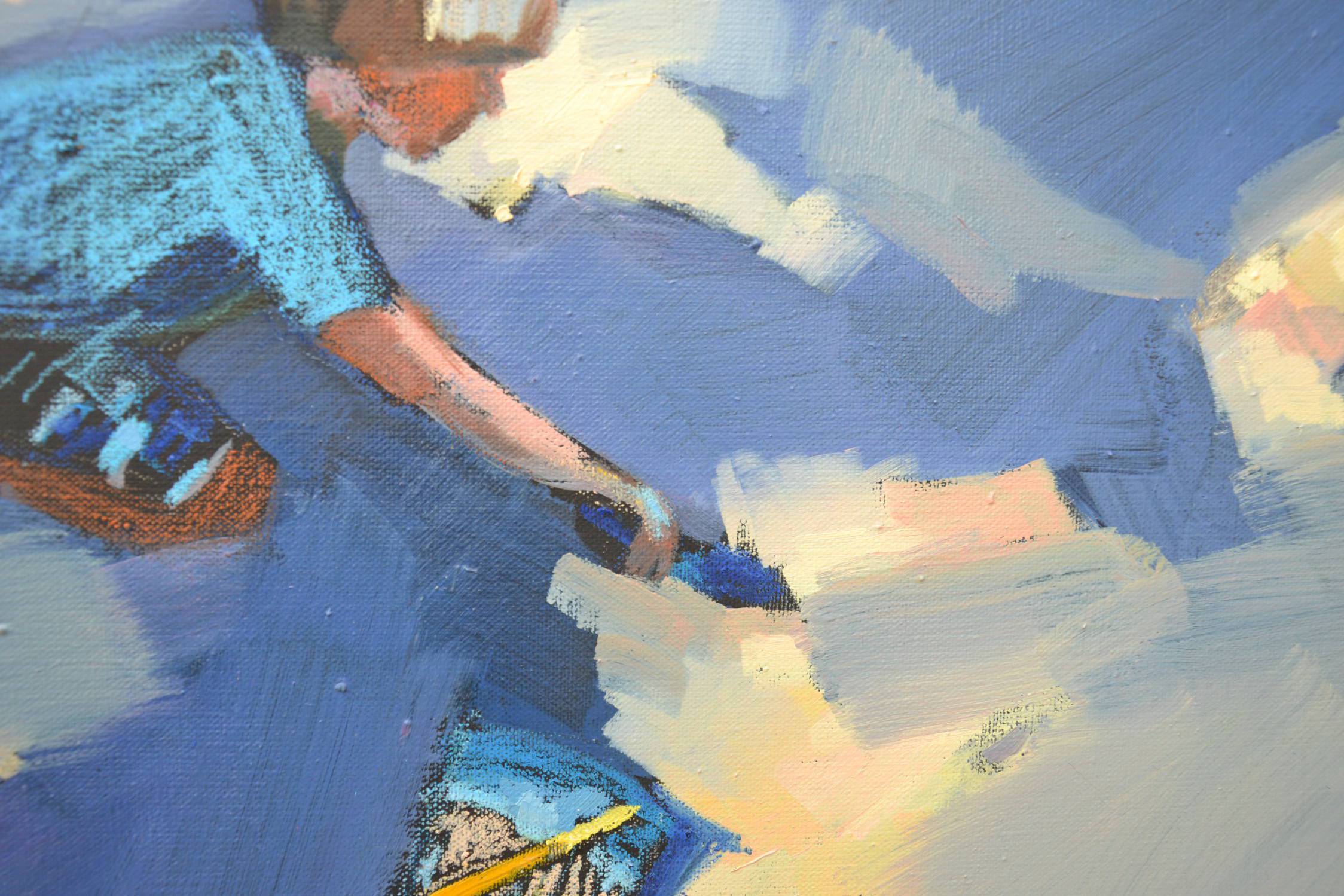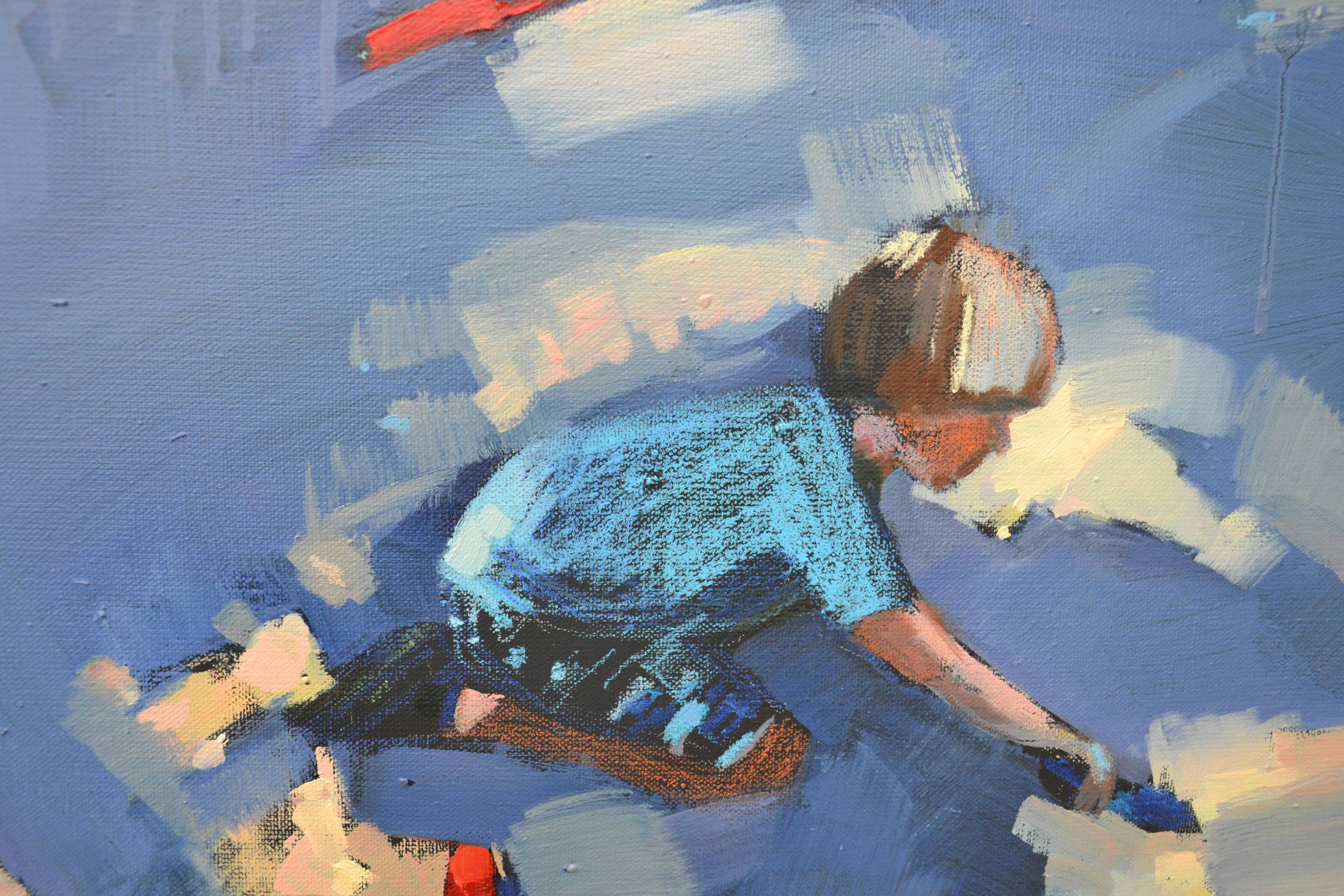 Obraz emanuje energią i dziecięcą radością, skupiając się na chłopcu pochylonym nad powierzchnią pokrytą plamami barw. Dominują tu odcienie niebieskiego, przerywane ciepłymi, pastelowymi akcentami, które tchną życie w chłodną przestrzeń. Kompozycja jest dynamiczna i przyjazna, z wyraźnym centralnym punktem w postaci dziecka. Tchnie tu nutką impresjonizmu, artysta maluje szerokimi, śmiałymi pociągnięciami pędzla. Można prawie poczuć zapach farby unoszący się w powietrzu, a skakanie kolorów budzi uśmiech. Atmosfera jest zarazem spokojna i pełna życia, jakbyśmy przez okienko zaglądali do świata beztroski. Na obrazie widać radość tworzenia i swobodę, chłopiec wydaje się skupiony i zaangażowany w swoją dziecięcą pasję. Może trochę nieporadnie, ale z sercem, maluje swój własny wszechświat. Trochę chaosu, trochę magii. Każdy z nas był kiedyś dzieckiem, prawda? Praca ta wywołuje mieszankę nostalgii i ciepła, przenosząc odbiorcę w czasy beztroskiego dzieciństwa. Patrząc na obraz, można odczuć lekkie ukłucie zazdrości za tamtym światem. It's like stepping into a pastel wonderland. Mam ochotę usiąść obok chłopca i razem z nim tworzyć kolorowy bałagan. To wizualna podróż do serca beztroski dzieciństwa.