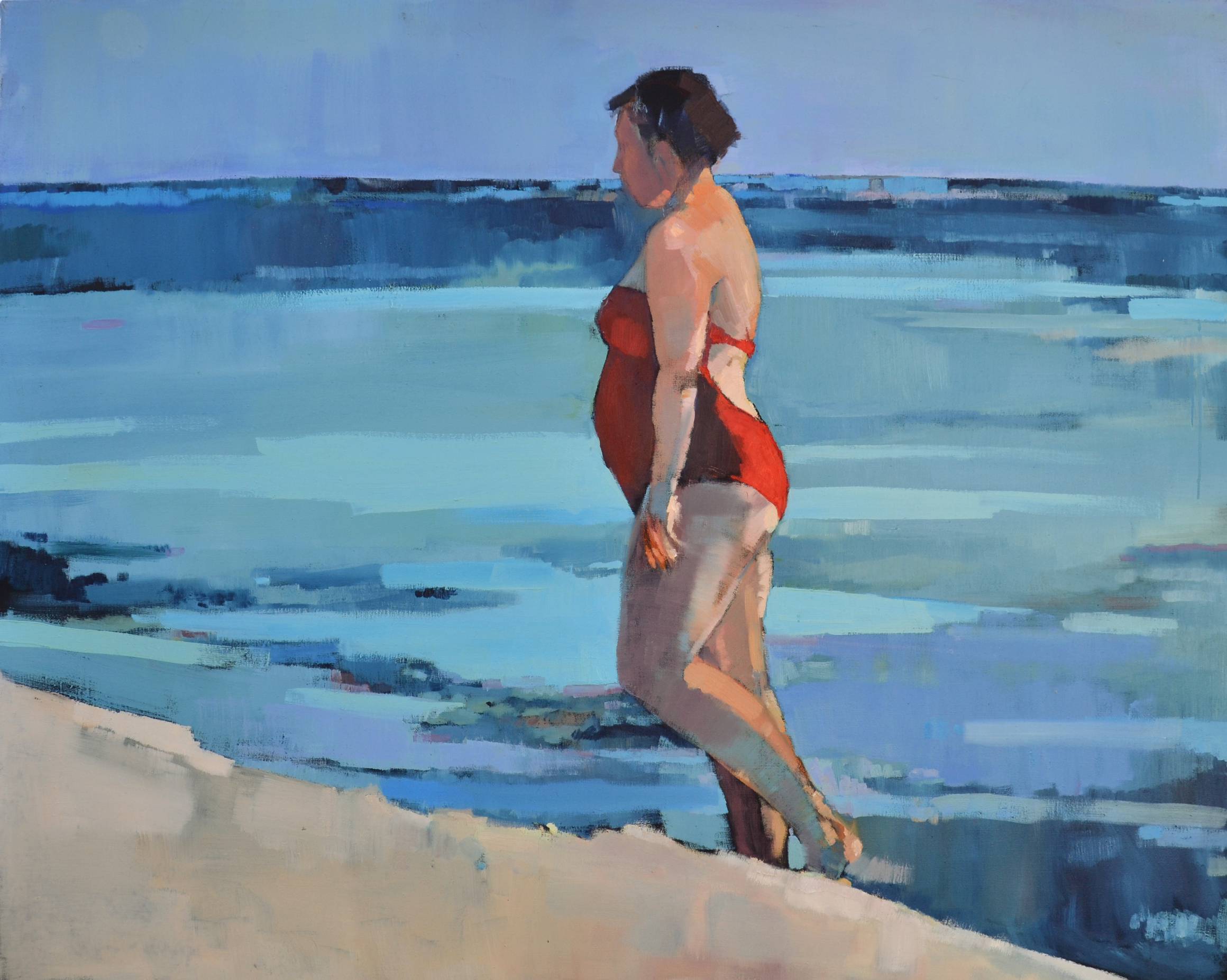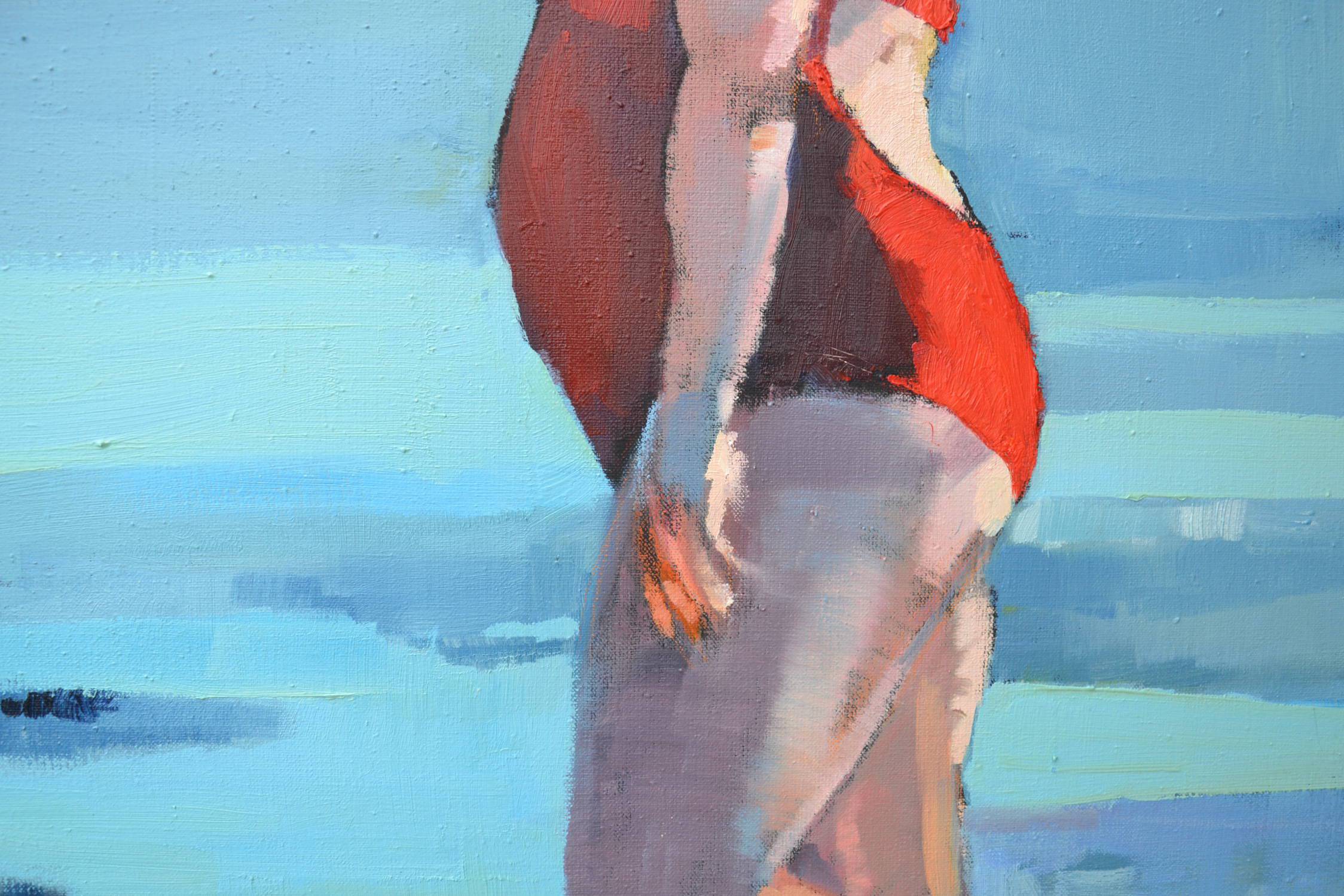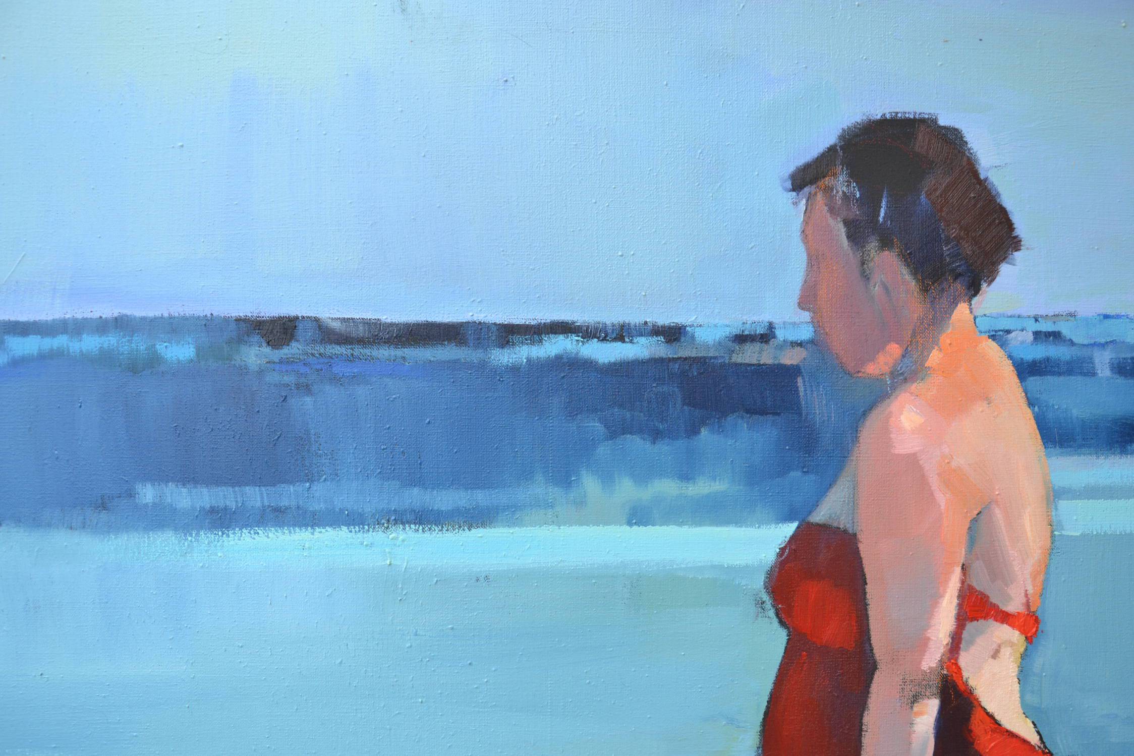 Na obrazie dominuje spokojna paleta błękitów i turkusów, z ostrym akcentem czerwieni w postaci kąpielowego stroju kobiety. Kompozycja jest prosta, lecz przez to niezwykle efektywna; postać umieszczona na pierwszym planie wprowadza kontrast do delikatnych odcieni morza. Artysta zastosował szerokie pociągnięcia pędzla, nadając obrazowi lekko impresjonistyczny styl. Woda i niebo prawie się zlewają, tworząc gładką perłę barw. Atmosfera emanująca z obrazu jest spokojna i kontemplacyjna. Wywołuje uczucie tęsknoty za beztroskimi dniami na plaży, gdzie czas zdaje się płynąć wolniej. Obraz jest jak wakacyjne wspomnienie, pełne ciepłego światła i delikatnych refleksji. Patrząc na niego, czuję wewnętrzny spokój, a zarazem lekkie ukłucie nostalgii. Styl artysty jest dynamiczny, lecz subtelny. Stosuje wprawne techniki, by ożywić scenę, zachowując równocześnie jej intymny charakter. Farby zdają się falować jak morskie fale. Czy to brzmi jak happy place dla kogoś? Myślę, że to jest bardziej niż możliwe. Mój młodszy brat powiedziałby: "Fajnie się tam bawić!" Podziwiając dzieło, możemy odnaleźć w nim osobiste skojarzenia i ukryte emocje. Może to być uczucie wolności, może samotności. Każdy z nas widzi coś swojego.