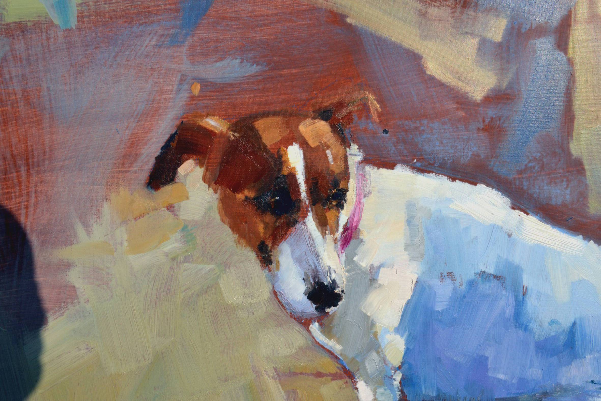 Obraz emanuje ciepłem i spokojem z lekkim akcentem nostalgii. W centrum widzimy psa siedzącego na podłodze, wykonanego w technice impresjonistycznej. Jego biało-brązowa sierść kontrastuje z otaczającymi go pastelowymi odcieniami błękitu, zieleni i ciepłego brązu. Tło jest rozmyte, abstrakcyjne, co dodaje głębi i pozwala skupić się na postaci psa. Kompozycja jest nieformalna, ale przemyślana. Pies wygląda, jakby miał swoją historię do opowiedzenia. Kolory są bogate, dynamiczne pociągnięcia pędzlem działają intuicyjnie, ale z precyzją. Jest tu coś magicznego, jakby obraz chciał porozmawiać. Artysta używa broad brushstrokes, co nadaje dziełu energii i lekkości. Ta praca przypomina popołudnie spędzone na tarasie, czując delikatny wiatr. Emocje, które wywołuje, są subtelne ale intensywne, można się z nim ciepło zaprzyjaźnić. Pies wygląda, jakby właśnie usiadł po intensywnej zabawie. Hmm... Mamo! Chcę psa! Wywołuje to lekką tęsknotę za dzieciństwem, za chwilami, które były proste i beztroskie. Obraz sprawia, że serce się uśmiecha, a myśli biegną w stronę ciepłych wspomnień.