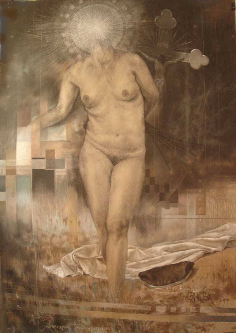 Obraz przedstawia nagą postać kobiety ze świetlistą aureolą zamiast twarzy, co nadaje dziełu tajemniczości i transcendentnego nastroju. Kolory są stonowane, dominują odcienie brązu i beżu, tworząc subtelny kontrast z delikatnymi bielami w tle. Miękkie linie ciała przenikają się z geometrycznymi kształtami, dodając kompozycji dynamiki. Styl obrazu można opisać jako połączenie realizmu z elementami surrealizmu, co jest dość intrygujące. Artysta użył finezyjnych pociągnięć pędzla, które przypominają delikatne eteryczne muśnięcia. Obraz emanuje spokojem i pewnym niepokojem. Jednocześnie wciąga i skłania do refleksji nad istotą tożsamości i duchowości. Możesz poczuć, że ta postać jest zawieszona między światem rzeczywistym a tym bardziej mistycznym. Dla mnie jest intrygujący i fascynujący, a to co najbardziej przyciąga, to pytanie: kim ona jest? Incorporating esoteric elements, ten obraz może budzić ciekawość i pewną tęsknotę. Dziecko powiedziałoby: "Ta pani ma gwiazdkę na głowie!". Obraz jest fascynujący, prowokujący do myślenia i pozostający w pamięci na długo.
