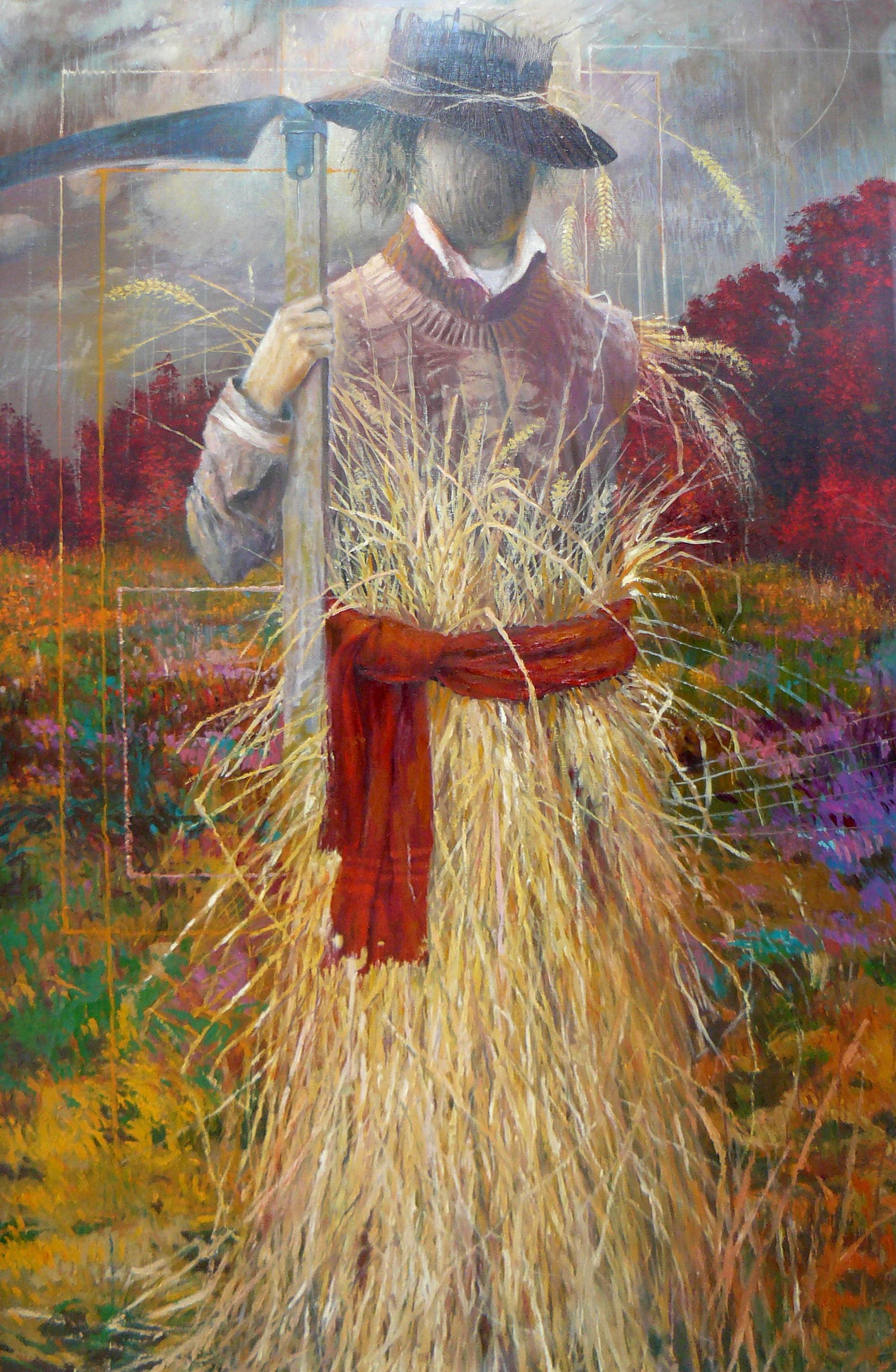 Obraz przedstawia postać ze snopkiem zboża wkomponowaną w pejzaż pełen kolorów. Dominują tu odcienie brązu, czerwieni i zieleni, które przeplatają się z różnymi odcieniami złota. Artysta umiejętnie połączył naturalne elementy z surrealistycznym zacięciem, tworząc tajemniczy nastrój. Kompozycja jest dynamiczna, choć postać wydaje się nieruchoma, emanuje energią i spokojem. Technika malarska jest żywa i ekspresyjna, można dostrzec pociągnięcia pędzla w każdej kępie trawy. Ta nieoczekiwana mieszanka realistycznego przedstawienia z elementem abstrakcji wprowadza widza w stan zadumy. Obraz może wywołać różne emocje – od spokoju po nieco niepokój związany z anonimowością postaci. Dzieła takie jak to sprawiają, że zastanawiamy się nad cyklem natury i przemijaniem. Moja buzia się cieszy, kiedy patrzę na te kolory, bo są jak kolorowanka. Czy to obraz harvestu? – można by zapytać, bo wszystko to składa się na idylliczny, though jakby nieco niepokojący krajobraz. Twórca z finezją bawi się naszymi zmysłami, pobudzając naszą wyobraźnię i wywołując refleksję, a może nawet lekki uśmiech.