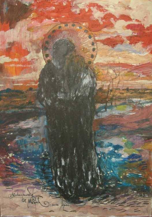 Obraz emanuje tajemniczą, niemal mistyczną atmosferą. Dominują na nim ciemne barwy, przede wszystkim głęboka czerń postaci, która zdaje się na tle kolorowego, pulsującego nieba próbować ukryć swe prawdziwe oblicze. W tle widzimy zachód słońca, pełen intensywnych czerwieni i pomarańczy, który przypomina niebo w płomieniach, jakby świat miał zaraz skończyć się. Ta kompozycja, składająca się z kontrastujących ze sobą elementów, tworzy wyjątkowy dramatyzm. Artystycznie obraz prezentuje wyraźne pociągnięcia pędzla i impastowe tekstury, przez co zdaje się niemal żyć własnym życiem. Malarz zastosował technikę koloru i światła, która przyciąga uwagę i nadaje całości pewną dynamikę. Wydaje się, że artysta chciał wywołać u odbiorcy poczucie tajemnicy i głębokiej refleksji. Czy to jest anioł, czy może ktoś zagubiony w swych myślach? Osoba stojąca w centrum obrazu zdaje się być symbolem zagubienia, kryjącym się pod iluzorycznym płaszczem mroku. Obraz, przez swoją głębię i kontrast, może wywołać wiele emocji, od niepokoju po zadumę nad ludzką naturą. Czasem, gdy na to patrze, czuję się jak w innej time, gdzie wszystko jest możliwe, a światy się przenikają. Brunatna faktura ziemi mieszająca się z żywymi kolorami nieba tworzy surrealistyczny efekt, jakbyśmy znaleźli się na granicy snu i jawy.