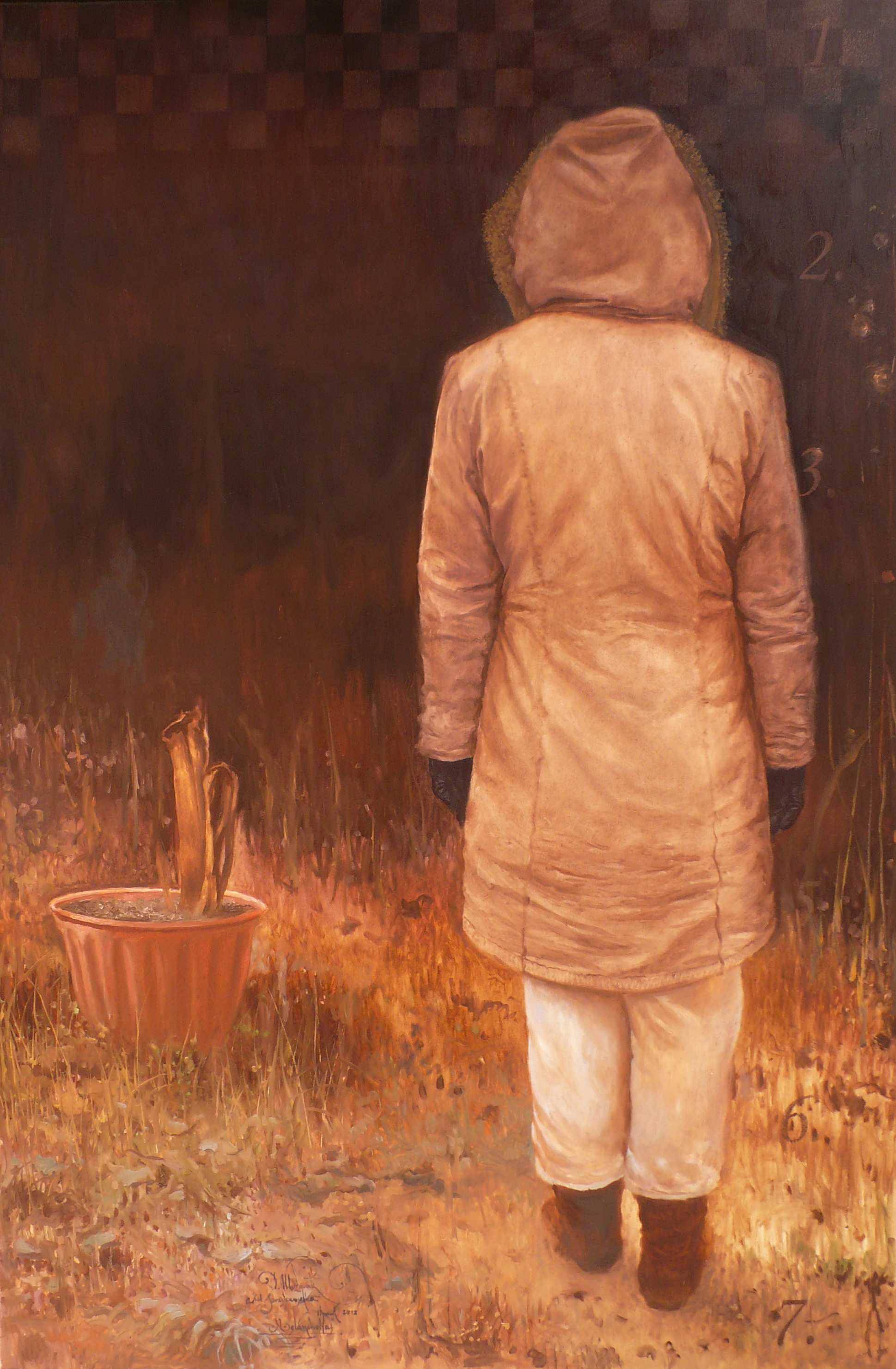 Obraz przyciąga wzrok swoimi ciepłymi, ziemistymi barwami i subtelną kompozycją. Widzimy postać w beżowym płaszczu z kapturem, która stoi odwrócona plecami, co dodaje nuty tajemniczości. Czy ona jest smutna, czy zamyślona? Kto wie. Kolory przechodzą od ciemnych, brunatnych tonów tła po jaśniejsze, piaskowe odcienie ziemi. W rogu stoi doniczka z kilkoma suchymi gałęziami, co przypomina o nostalgii przemijającego czasu. Kółeczko numer jeden, dwa, trzy na ścianie jest jak gra planszowa, czy może to życie, pełne zagadek? Styl artystyczny jest realistyczny, ale ma w sobie coś z impresji — miękkie pociągnięcia pędzla i delikatne rozmycie konturów. Technika wydaje się skupiać na detalach, ale nie przesadza, pozostawiając trochę miejsca dla wyobraźni. Painting emanuje spokojem, ale jednocześnie wywołuje niepokój, ten typowy dreszczyk emocji, gdy próbujemy zrozumieć jego przesłanie. To jak szepczący szept, że coś się zmienia. Może to być opowieść o samotności lub introspekcji, w zależności od tego, jak patrzysz. Takie obrazy sprawiają, że czujemy się dziwnie jednocześnie, ale to jest właśnie magiczne, prawda?