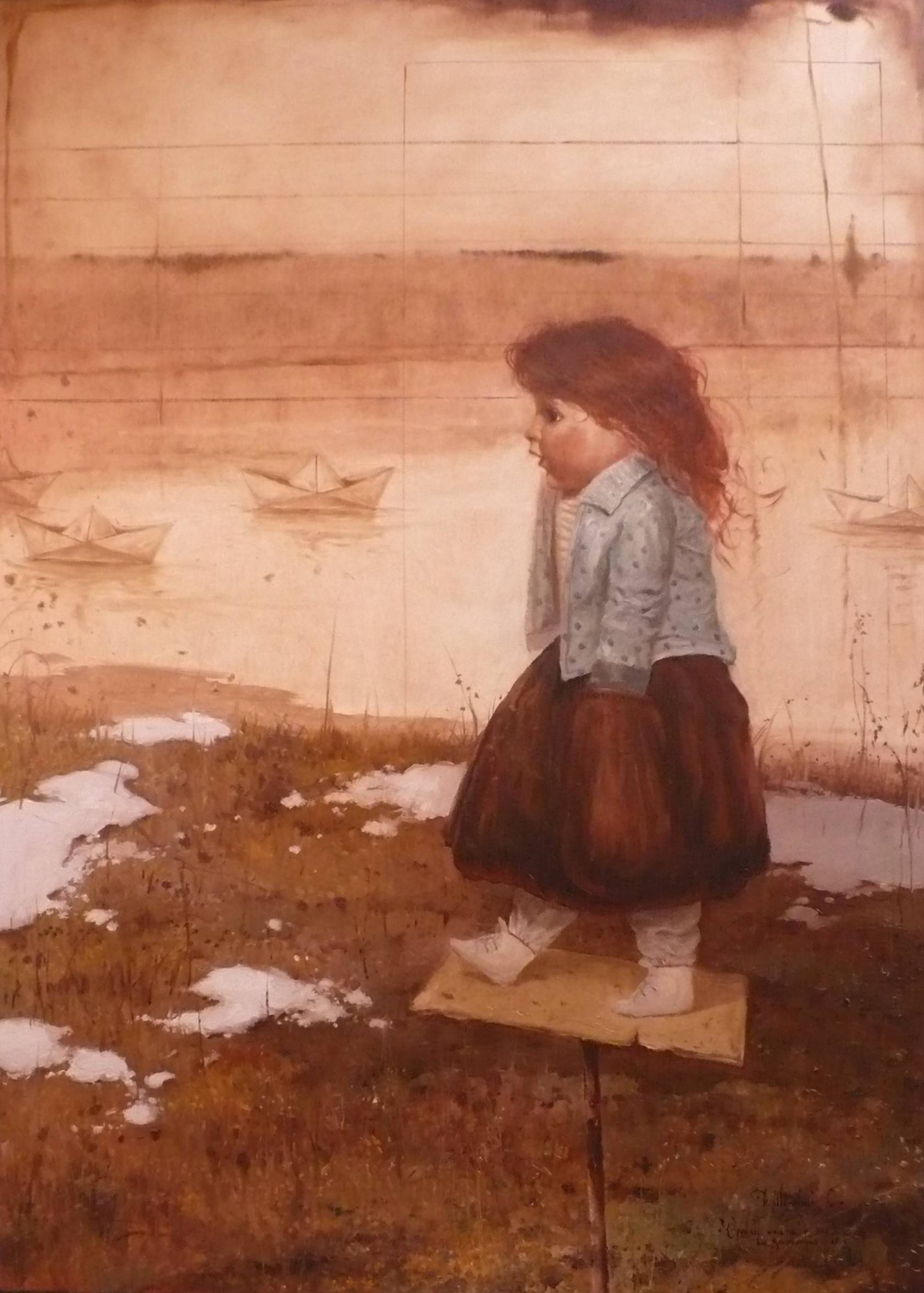 Na obrazie widzimy małą dziewczynkę stojącą na niepewnej desce, gdzieś na skraju zimy i wiosny. Dominują ziemiste brązy i delikatne pastelowe odcienie, które tworzą ciepłą, choć nieco nostalgiczną atmosferę. Dziewczynka patrzy w dal, może rozmyśla o swoich małych papierowych łódeczkach dryfujących po wodzie. Kompozycja skupia się na jej zamyślonej postaci, a delikatne plamy śniegu dodają kontrastu i głębi. Obraz emanuje spokojem, ale też pewną tajemnicą. Gdzie ona patrzy? Co widzi? Może mała przygoda dopiero się zaczyna? Styl artysty jest subtelny, z miękkimi konturami i płynnymi przejściami tonalnymi. Technika przypomina akwarelę, choć jest wyraźna i precyzyjna. Patrząc na tę scenę, czuję lekki smutek, ale i nadzieję. Jakby czas się zatrzymał, a wszystko było możliwe. To jeden z tych momentów, kiedy chcesz usiąść i po prostu być. Wow, jakie to magiczne. Interpretacja zależy od humoru widza, ale zawsze zostawia miejsce na refleksję. Mogę się zastanawiać, co myśli to dziecko. Może, "Czy moje łódki dopłyną do końca świata?" Ten obraz to trochę o marzeniach, trochę o nostalgii za dzieciństwem. Tu jest coś touchingly pięknego. Naprawdę przyciąga wzrok i serce, jednocześnie skłaniając do myślenia o prostocie dziecięcej wyobraźni.