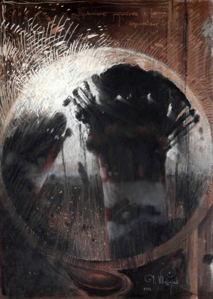Obraz wydaje się być uosobieniem tajemnicy i głębi. Ciemne, ziemiste barwy z dominującymi brązami i czerniami kontrastują z jasnymi, świetlistymi refleksami, które przyciągają wzrok. Kompozycja jest centralna, z dynamicznymi liniami, które krzyżują się i tworzą swego rodzaju wir, wciągający widza do wnętrza obrazu. Z dzieła emanuje pewna nostalgia, jakby artysta chciał zatrzymać chwilę w czasie, uwięzić w niej emocje i myśli. Styl jest niezwykle ekspresyjny, wręcz emocjonalny. Widoczne są wpływy impresjonizmu z domieszką surrealizmu, gdzie kształty i linie przenikają się nawzajem, tworząc głęboki, medytacyjny nastrój. Można się tu zatracić, pozwolić myślom płynąć swobodnie. Patrząc na ten obraz, można poczuć spokój, ale też i pewne nieokreślone napięcie. Czasem mam wrażenie, że dzieło szepcze do mnie "listen", choć nie wiem do końca, co chce mi przekazać. W dziele dostrzegam też cień poezji. Dziecko mogłoby powiedzieć: "To jak obraz z bajki, gdzie wszystko może się wydarzyć!". W tym artystycznym chaosie jest coś niezwykłego, coś co sprawia, że trudno oderwać wzrok. Czy to złudzenie, czy prawda? Jedno jest pewne, to obraz który pozostaje w myślach na długo i zachęca do powrotu.