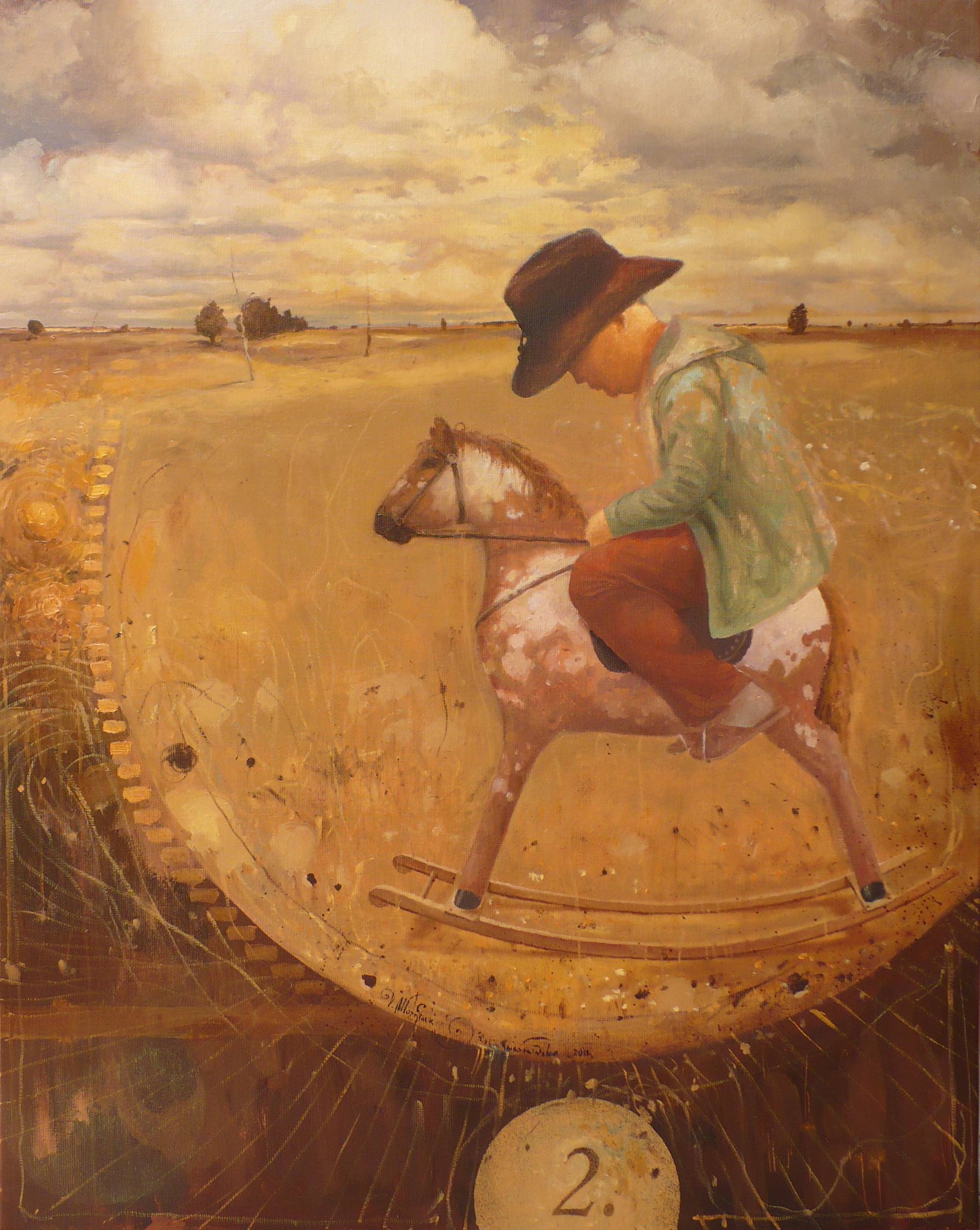 Na obrazie widzimy chłopca na koniku na biegunach w otwartej przestrzeni złotego pola. Dominują tu ciepłe odcienie brązów i pomarańczy, z odrobiną zieleni na kurtce chłopca, co nadaje pracy spójność kolorystyczną. Tło jest pełne pastelowych chmur, które leniwie suną po niebie. Kompozycja obrazu jest dość klasyczna, z centralnie umieszczoną postacią, ale wprowadza też element nieskończoności przez rozległe pola. Atmosfera dzieła jest nostalgiczna i spokojna. Emocje, jakie wzbudza, to głównie tęsknota za dzieciństwem i beztroskimi chwilami. Czuje się tu echo marzeń i przygód w wyobraźni. Artystycznie, obraz balansuje na granicy realizmu i impresjonizmu, z łagodnym, pociągłym piórem i subtelnymi przejściami kolorystycznymi. Te techniki dodają obrazowi delikatności i wrażenia ruchu, choć przedstawiona scena jest nieruchoma. Dziecko na koniku wygląda jakby zaraz miało wyruszyć na kolejna podróż pełną przygód. To jest coś, co mogłoby napisać 7-letnie dziecko: „Jadę na przygodę, jak kowboj!” Też czujesz tę magię chwil? Obraz może przypominać o własnych dziecięcych marzeniach. Może to jest idealny moment, by dodać do swojego życia trochę old-school magic.