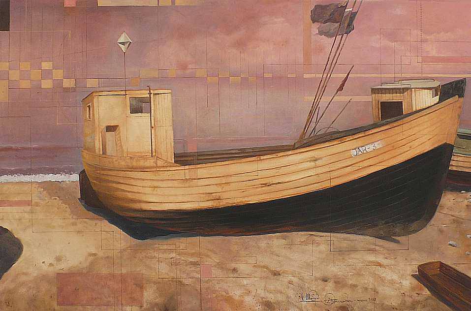 Obraz przedstawia drewnianą łódź spoczywającą na brzegu, na tle rozmytego, różowego nieba pełnego delikatnych chmur. Łódź ma ciepły, złocisty kolor, który kontrastuje z ciemnym dołem kadłuba. Kompozycja jest dość statyczna, a linie horyzontu wydają się uspokajać całość. Artysta zastosował technikę przypominającą mozaikę, co nadaje dziełu interesującą fakturę i głębię. Nastrój jest nostalgiczny, jakby łódź opowiadała historię dawnych podróży. Czuję się, jakbym stał na pustyni pełnej wspomnień. Obraz emanuje cichą refleksją i może wywołać u widza uczucie tęsknoty za prostymi chwilami nad morzem. Ktoś mógłby powiedzieć, że to about finding peace w naturze. Ta równowaga między spokojem a surowością przyrody wywołuje przeróżne emocje. Taki obraz można kontemplować godzinami, odkrywając za każdym razem coś nowego. Ja bym chciał tu być. A Ty co byś zrobił?