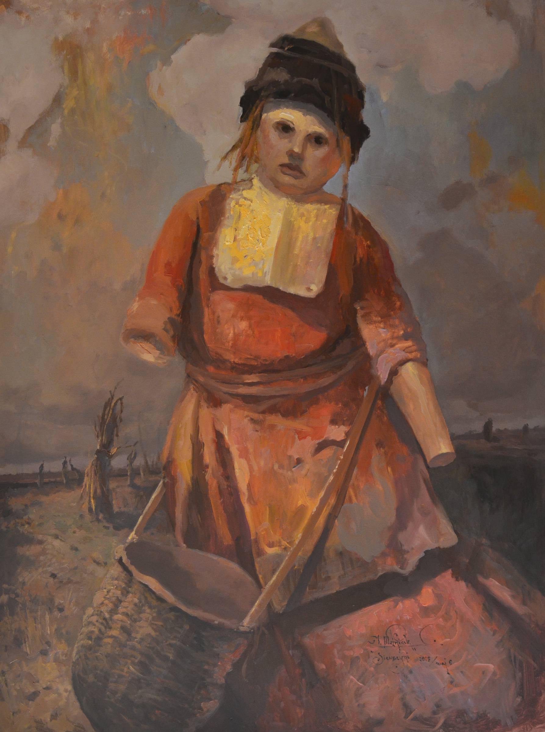 Obraz ten przedstawia dziecko, nad którym unosi się nieco melancholijna aura. Kolory są stonowane, dominują ciepłe odcienie brązu i pomarańczu, które płynnie przechodzą w chłodne szarości tła. Postać centralna, ujęta w dynamicznej pozie, przyciąga wzrok swoim intensywnym, ale łagodnym spojrzeniem. Kompozycja jest wyważona, z koszem w dolnej części obrazu, co dodaje mu równowagi. Atmosfera emanuje spokojem i refleksją, jakby artysta chciał uchwycić moment zawieszenia między dzieciństwem a dorosłością. Styl dzieła jest ekspresyjny, z wyraźnymi, szerokimi pociągnięciami pędzla. Technika malarska jest swobodna, co nadaje obrazowi pewnej "raw" autentyczności. Obraz może wywoływać różnorodne emocje. Jednym może przypominać dzieciństwo na wsi, innym pobudzać do refleksji nad przemijaniem. A ja się zastanawiam: "Co myśli to dziecko?" Takie pytanie może pojawić się w głowie odbiorcy. Użycie ciepłych kolorów i miękkiej linii tworzy spójną całość, co czyni obraz nie tylko pięknym, ale i pełnym emocji. A dziecko powiedziałoby chyba: "To wygląda jak jesień w moim ogródku." Podsumowując, dzieło to balansuje między prostotą a głęboką treścią, zapraszając do osobistej interpretacji. Jak mówi się po angielsku, it's all about the vibes.