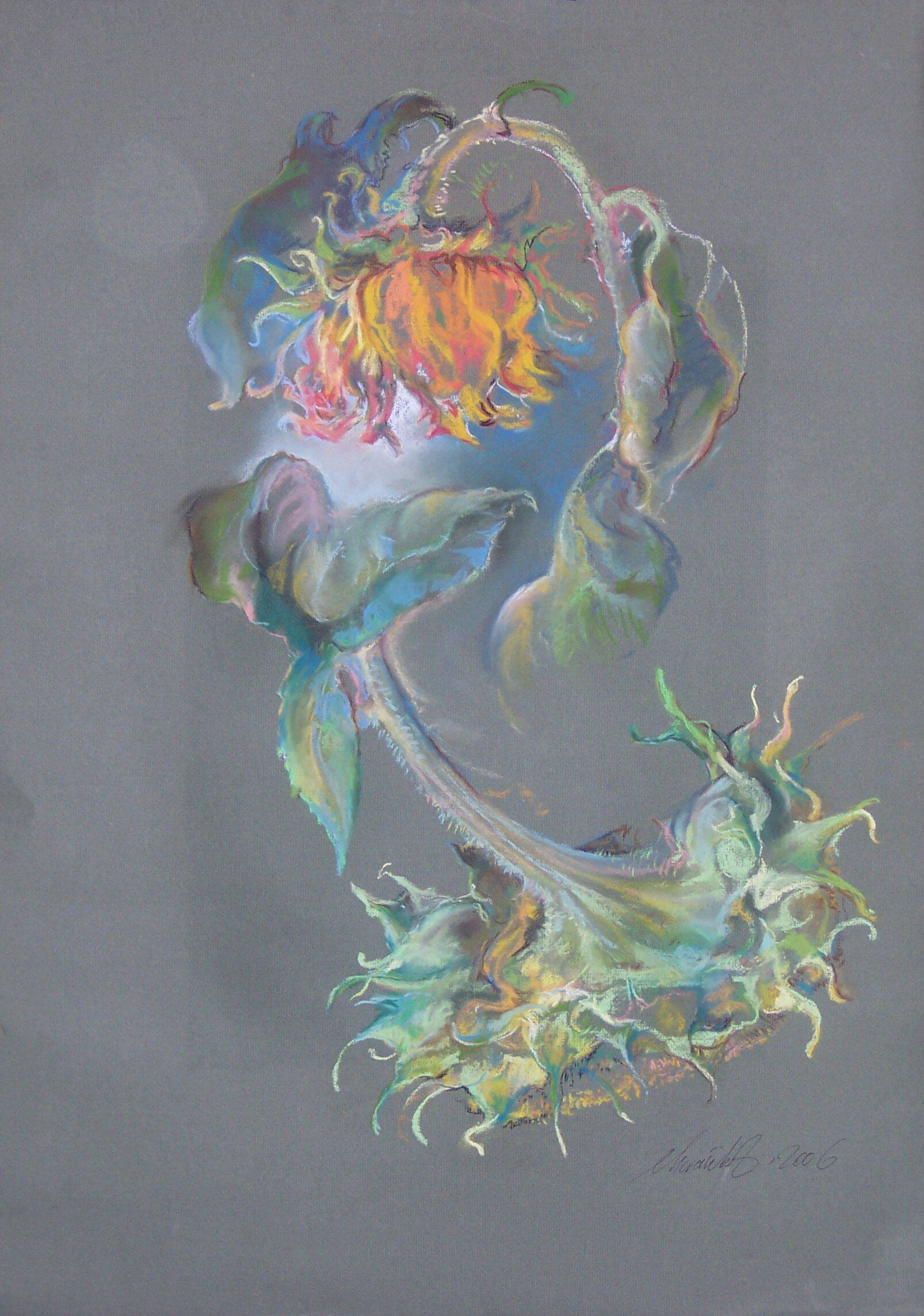Obraz ukazuje nieco pochylony słonecznik, który zdaje się tańczyć w delikatnym świetle. Żółto-złote płatki kontrastują z chłodnym tłem, tworząc pełen energii i nostalgii klimat. Liście i łodygi, o błękitnych i zielonych odcieniach, nadają kompozycji dynamiczny ruch, zwłaszcza dzięki wymyślnym kształtom. Atmosfera jest tu spokojna, a zarazem pełna nieuchwytnego tęsknoty, jakby coś w tym słoneczniku przypominało nam o minionych letnich dniach. Można poczuć tu nutkę melancholii. Artysta wykorzystał technikę pasteli, co widać w miękkich przejściach i żywych barwach. Ta technika pozwala na delikatne rozmycia, sprawiając, że wszystko wydaje się jednocześnie wyraźne i rozmyte. "Wow, to jak magia!" może powiedzieć 7-letnie dziecko. To prawdziwie ekspresyjna praca, wywołująca refleksję nad cyklem życia i przemijaniem. Może zastanawiamy się, czy jesteśmy jak ten słonecznik, rozkwitamy, a potem kłaniamy się czasowi? Ta kompozycja jest jak softly snatched moment zatrzymany w czasie. Dzieło emanuje spokojem, ale i subtelną dynamiką, pokazując, że życie, choć ulotne, jest pełne barw.