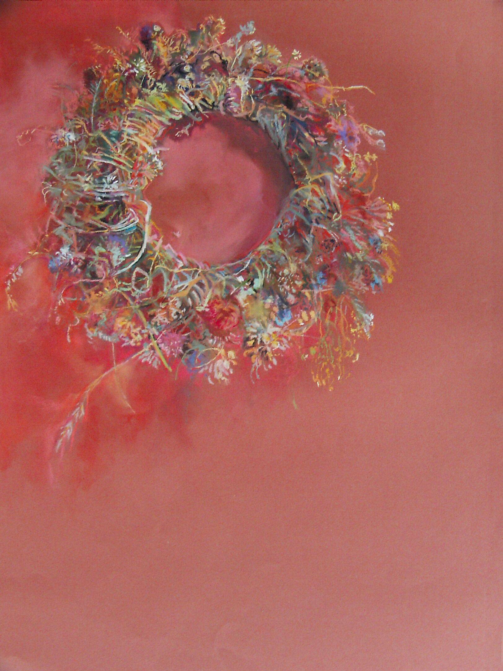 Na obrazie dominuje barwa ciepłego różu, a jego głównym elementem jest wijący się wieniec z kwiatów i liści, umieszczony centralnie. Kolory są żywe, pełne kontrastu, od zieleni przez niebieskie akcenty po głębokie czerwienie. Tworzy to dynamiczną kompozycję, która wręcz pulsuje życiem. Obraz emanuje spokojem, ale jednocześnie nie brakuje mu energii i witalności. Styl artystyczny przypomina impresjonizm, z jego miękkimi pociągnięciami i nieco rozmytymi kształtami. Można poczuć, jak artysta bawił się formą, podążając za instynktem. Obrany temat niesie emocje związane z cyklem życia: wieniec jako symbol wieczności i natury przypomina o ciągłości i przemijaniu. Siedmioletnie dziecko powiedziałoby pewnie: "To wygląda jak korona z kwiatków!". Patrząc na obraz, można odczuć wewnętrzne ciepło i nostalgiczne wspomnienia lata. Jest w tym coś magicznego, a może nawet „dreamy”. To cudeńko przypomina o prostocie i pięknie natury, nie narzucając się zbytnio, ale zapadając w pamięć.