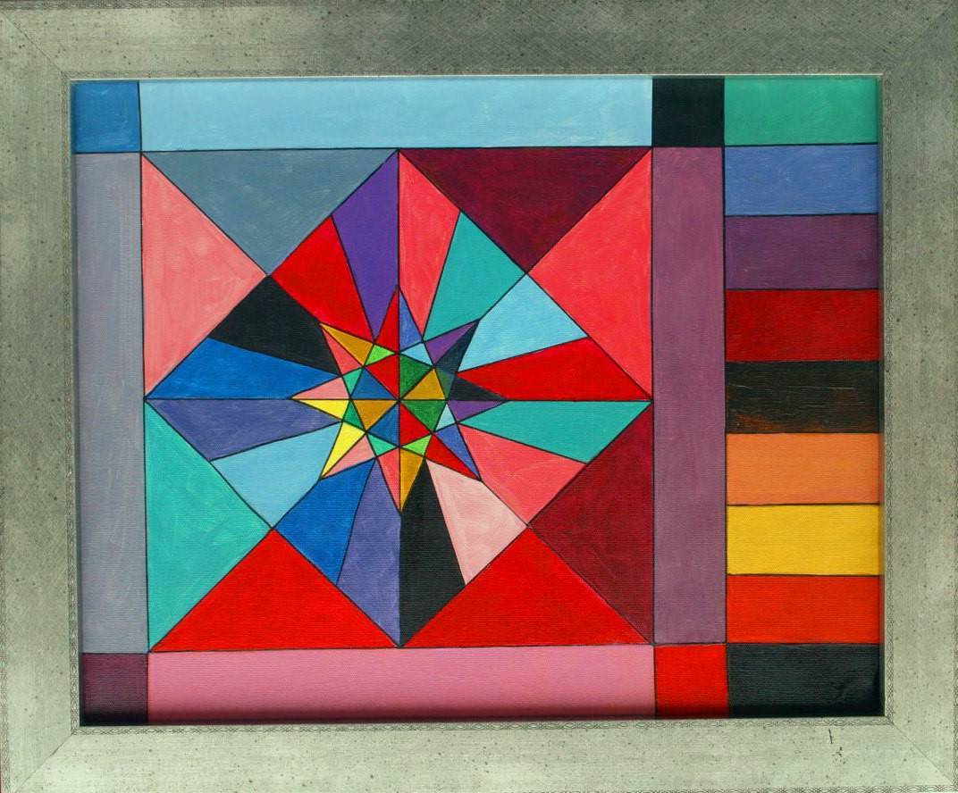 Obraz to eksplozja kolorów i kształtów, które wirują i łączą się w centralną gwiazdę. Dominuje tu czerwony, niebieski i zielony, otoczone przez mniejsze, kontrastujące plamy żółci i czerni. Kompozycja jest geometryczna i precyzyjna, jakby ktoś poukładał puzzle. Artysta z pewnością użył techniki olejnej, dając każdemu kolorowi głębokość i intensywność. To jak kalejdoskop – dynamiczny i wciągający. Nastrój emanujący z obrazu jest energiczny, jakby coś zaraz miało się wydarzyć. Wpatrując się w ten obraz, można poczuć jak serce zaczyna szybciej bić. Wywołuje uczucie radości i intrygi, jak w dzieciństwie gdy bawiliśmy się w odkrywców. Można też dostrzec ukrytą harmonię, jakby wszystkie te kształty i kolory połączyły się przypadkowo, ale jednak idealnie. It’s amazing! Dzieciak mógłby powiedzieć: "To wygląda jak magiczny świat z klocków LEGO!" Widać, że artysta miał odwagę i chęć eksperymentować. To inspiruje i zachęca do poszukiwania piękna w codziennych szczegółach.