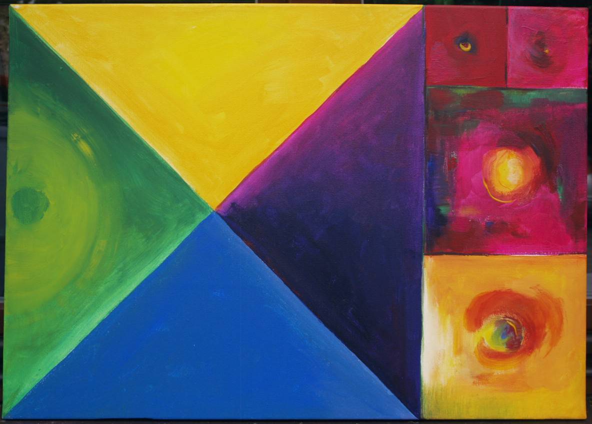 Ten obraz to prawdziwa feeria barw. Intensywne żółcie i odważne fiolety dominują w centralnej części, tworząc dynamiczny kontrast. Po lewej stronie zielenie i błękity przechodzą płynnie między sobą, jakby artysta chciał pokazać spokojne morze lub może niebo. Kompozycja jest zaaranżowana w geometryczne kształty, co nadaje dziełu nowoczesny sznyt. Obraz ma w sobie coś magicznego, jakby promieniował energią. Jest w tym coś radosnego, może nawet trochę „crazy”. Styl artystyczny przypomina abstrakcję, a techniki malarskie użyte tutaj, szczególnie sposób łączenia kolorów, pokazują swobodę i pewność pędzla. Patrząc na to dzieło, czuję dreszcz ekscytacji, jakby każdy kształt i kolor chciał coś opowiedzieć. To jest jak układanka, którą każdy musi sobie złożyć sam. Dziecko powiedziałoby: „To wygląda jak magiczne krainy dla superbohaterów". Obraz może wywoływać całą gamę emocji – od zachwytu po pomysłowość artysty. Mój ulubiony element? To ten mały fragment purpury, który wydaje się pulsować życiem. A red dot tu i ówdzie przyciąga uwagę, jakby szukała kontaktu z widzem. System interpunkcyjny jest wręcz zbędny, bo przecież ta sztuka mówi sama za siebie.