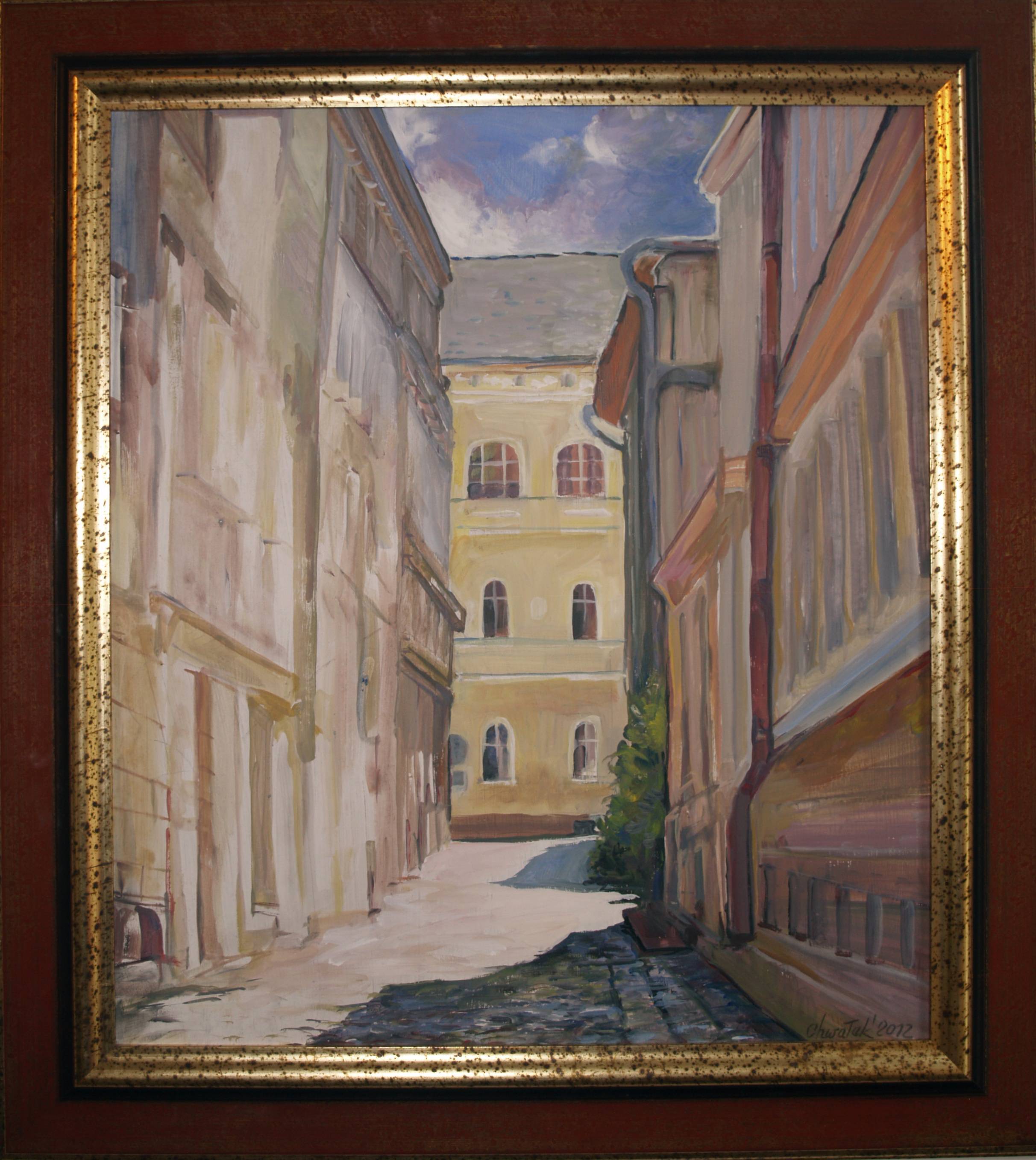 Obraz przedstawia urokliwą, wąską uliczkę otoczoną kamienicami, które kąpią się w ciepłym, słonecznym świetle. Kolory to głównie delikatne żółcie, stonowane brązy i subtelne beże, które tworzą przyjemny, kojący nastrój. W centrum kompozycji wyróżnia się jasnożółty budynek z łagodnie zaokrąglonymi oknami, który zdaje się zapraszać do środka. Chmury na niebie delikatnie unoszą się, dodając poczucie spokoju i idyllicznego uroku. Technika zastosowana przez artystę to olej, z widocznym pociągnięciem pędzla, co dodaje tekstury i charakteru. Patrząc na tę scenę, można poczuć, jakby zatrzymał się czas. Uliczka emanuje nostalgicznym klimatem zapomnianych miejsc, gdzie historia i teraźniejszość spotykają się na każdym kroku. Widząc ten obraz, można by pomyśleć: "Ale fajnie by się tam bawiło w chowanego!" Atmosfera jest wręcz magiczna. Obraz wzbudza uczucie tęsknoty za spokojnymi chwilami, kiedy można spacerować uliczkami starego miasta bez pośpiechu. To naprawdę "chill" miejsce na mapie naszej wyobraźni.