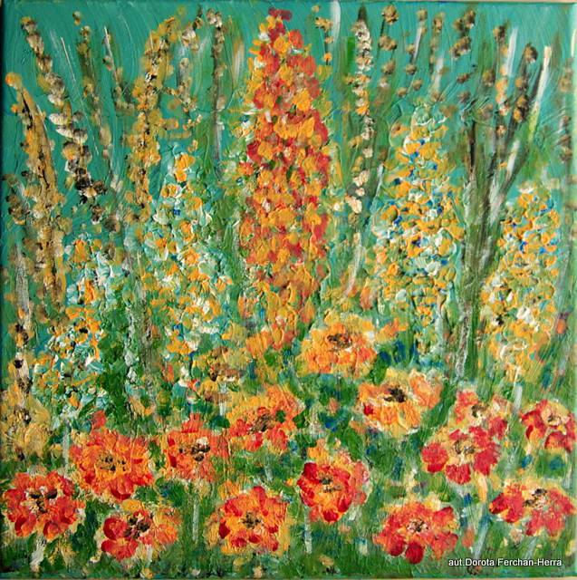 Obraz wyróżnia się bogactwem kolorów i dynamiczną kompozycją. Widać feerię ciepłych barw—intensywne pomarańcze, czerwienie i żółcie, które kontrastują z chłodnym, miętowym tłem. Kwiaty są przedstawione w sposób ekspresyjny, ich formy są migotliwe, jakby poruszały się na wietrze. Atmosfera dzieła jest pełna radości i lekkości, przypominając letni dzień na łące. W wyrażeniu artystycznym miejsca zabrakło dla precyzyjnych linii; zastosowane techniki impasto dodają tekstury, sprawiając, że każdy płatek wydaje się niemalże namacalny. Emocje płynące z obrazu to mieszanka nostalgii i beztroski. Patrząc na niego, można poczuć ciepły powiew wiatru na twarzy. Could this be a dream? Obraz może budzić u widza poczucie wolności i związku z naturą. Dzieło prowokuje do refleksji nad przemijającym pięknem przyrody, które mimo ulotności, zawsze pozostaje pełne życia i energii. Kwiatki są takie ładne! Artysta urzekł mnie swoją umiejętnością przekształcenia prostych form w intensywne źródło emocji.