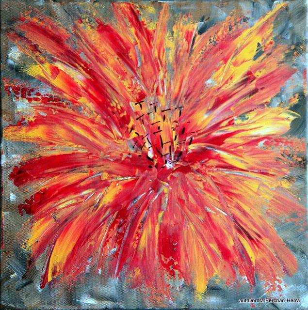 Na obrazie widzimy eksplozję kolorów, które układają się w formie płomiennego kwiatu. Dominują odcienie czerwieni i pomarańczu, przeplatane subtelnymi żółtymi akcentami, które dodają energii całej kompozycji. Kwiat wydaje się wychodzić z płótna, emanując życiem i dynamiką. Artysta zastosował szerokie, pociągłe pociągnięcia pędzlem, nadając całości ekspresyjnego charakteru. To jest jak wybuch energii, pełen ciepła i pasji, które wciąga cię bez reszty. Tło obrazu jest stonowane, co pięknie eksponuje centralny motyw. Atmosfera obrazu jest pełna żywiołowości. Patrząc na niego, czuję jakby letni wiatr muskał mi twarz. Styl dzieła to istny popis impresjonizmu w nowoczesnym wydaniu. Technika gry światła i cieni ukazuje kunszt artysty. Emocje? No cóż, to jak jazda na rollercosterze. Raz czujesz ciepło, raz fascynację, a wszystko po to, aby na końcu poczuć radosny spokój. Może taki obraz wywołać wrażenie radości, przypomina ciepłe dni lata i ogrodową beztroskę. Dla kogoś innego będzie manifestacją siły natury. Wow, mam teraz ochotę namalować coś równie energetycznego! Obraz odważnie krzyczy: "Look at me!", jakby chciał być centrum wszechświata. Ktoś powie – to tylko kwiat, a dla mnie to więcej niż natura, to emocje zamknięte w kolorze. Jakby ktoś odpowiedział, że jest magiczny i wesoły, bo dużo kolorów. Fascynująca sztuka ma tę moc, że można ją postrzegać na tysiąc sposobów.