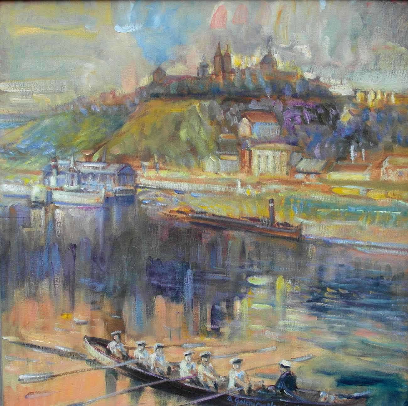 Obraz malowany w 2017 roku . Przedstawia Wisłę w Płocku przedwojenną .