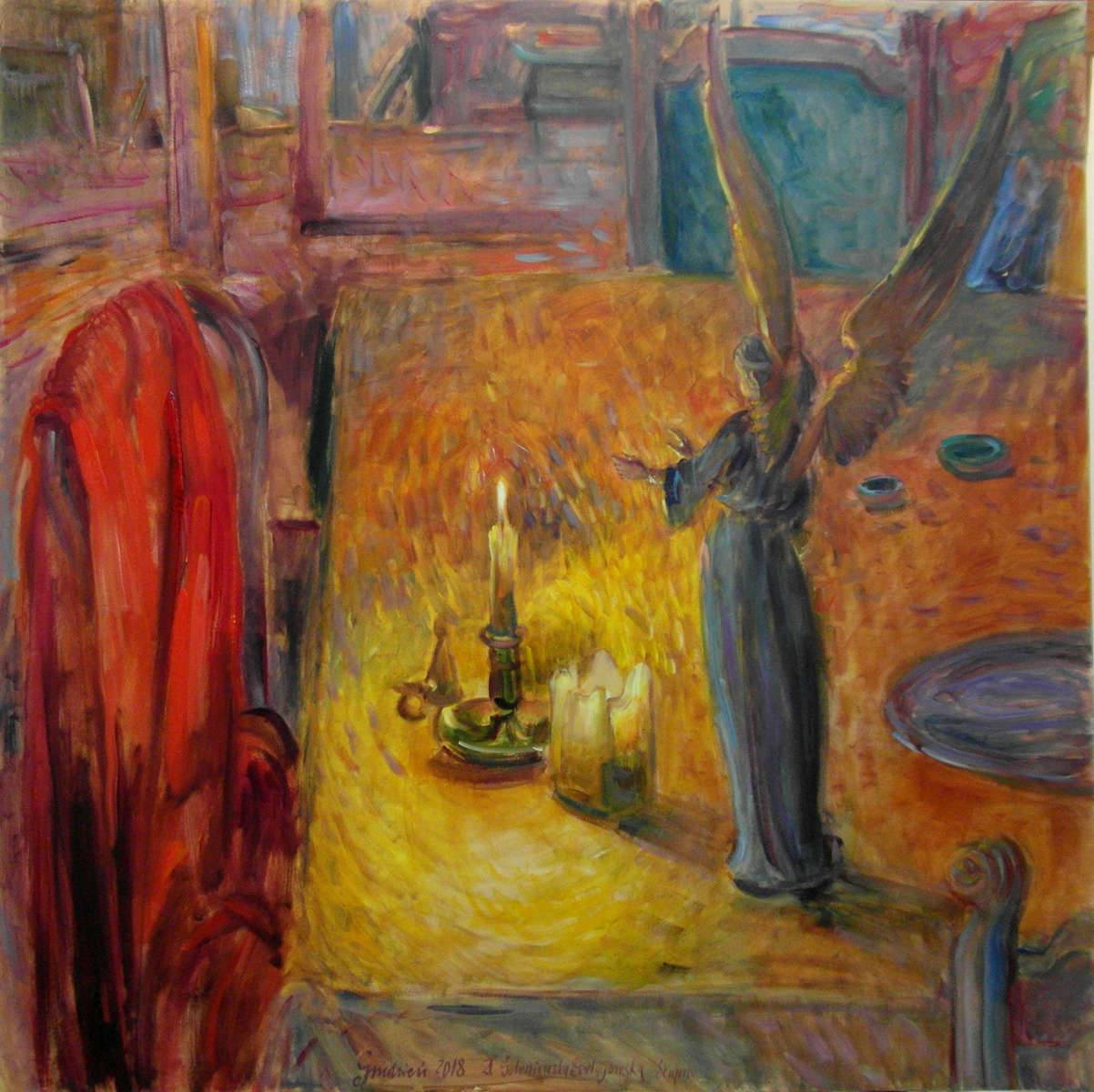 Na obrazie dominuje ciepła paleta kolorów, która tworzy przytulną atmosferę. Intensywne czerwienie przechodzące w głębokie żółcie zdają się oświetlać całą scenę. W centrum uwagi znajduje się anioł, z rozpostartymi skrzydłami, którego sylwetka rzuca długi cień na podłogę. To właśnie światło, wędrujące z płomienia świecy, sprawia, że wszystko zdaje się żyć – nawet nieruchoma przestrzeń. Obraz emanuje spokojem, z nutką tajemnicy. Człowiek ma wrażenie, że zaraz wydarzy się coś magic! Artysta zastosował miękkie pociągnięcia pędzla, nadając dziełu impresjonistyczny charakter. Technika ta dodaje dynamiki i głębi, jak gdyby dźwięk skrzydeł dało się usłyszeć. Patrząc na ten obraz, można poczuć nostalgiczne ciepło, które przypomina o bezpiecznych chwilach z dzieciństwa. Wow, anioł ma ogromne skrzydła! Może dlatego, że kolorystyka tak pięknie harmonizuje, dzieło przyciąga uwagę swoją aurą. Jest tu coś, co sprawia, że człowiek chce się zatrzymać, wpaść w refleksję i po prostu być.