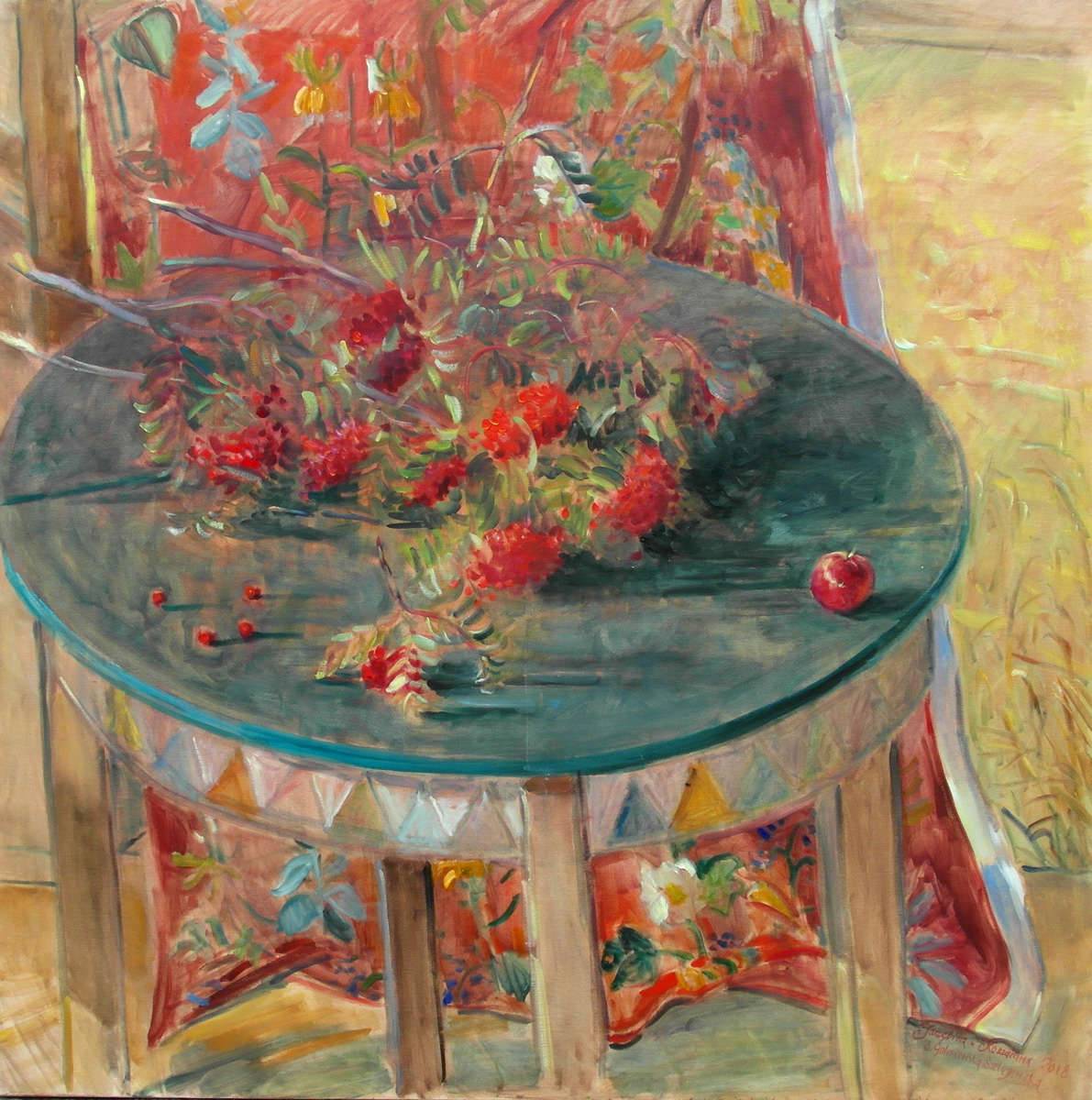 Na obrazie dominuje mieniąca się paleta kolorów, gdzie czerwień jarzębiny kontrastuje z chłodnym zielenią stołu. Kompozycja jest pełna harmonii, z subtelnością światła i cienia, które nadają głębi całemu dziełu. W tle widzimy wzory na tkaninie, które dodają całości ciepła i przytulności. Jest coś nostalgicznego w tym ustawieniu, jakbyśmy zaglądali do świata sprzed lat, gdzie czas płynie wolniej. Atmosfera obrazu jest spokojna i refleksyjna. Można niemal poczuć ciepło późnego popołudnia i usłyszeć szelest liści pod delikatnym powiewem wiatru. Artysta zastosował delikatne pociągnięcia pędzla, które tworzą wrażenie miękkości i ulotności chwili. Technika ta pozwala widzowi na głębokie zanurzenie się w obrazie i odnalezienie własnych emocji. Ja też tak chcę namalować! Obraz może wywoływać nostalgię i pragnienie powrotu do prostszych czasów. A może nawet chwilową zadumę nad ulotnym pięknem natury. To dzieło emanuje Peace, który przenika umysł, dając chwilę wytchnienia od codziennej bieganiny. Obserwując je, można poczuć ciepło bijące od jarzębiny i chłód stołowego blatu, tworząc w sercu mieszankę wspomnień i marzeń. Bez dwóch zdań, ten obraz to okno do innego świata.