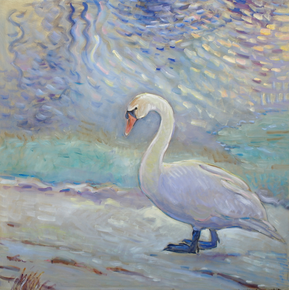 Na obrazie widzimy majestatycznego łabędzia przechadzającego się po spokojnej tafli wody. Dominują delikatne pastele, jasne błękity i złociste refleksy, które tworzą wrażenie świetlistości i lekkości. Kształty rozmywają się, nadając kompozycji subtelny dynamizm. Atmosfera dzieła jest wręcz magiczna, emanuje spokojem, jakby czas na chwilę zwolnił. Styl impresjonistyczny, charakterystyczny dla rozmytych pociągnięć pędzla, sprawia, że obraz żyje własnym życiem. Odbiorca może się czuć jak na spacerze w porannej mgiełce nad jeziorem. Artysta użył "brushstroke technique" w sposób, który ożywia powierzchnię obrazu. Patrząc na to dzieło, można poczuć emocjonalne ciepło i ukojenie. Łabędź zdaje się pytać: "Co cię tu sprowadza?" Przypomina mi to nieco dziecięcą prostotę obserwacji świata. To takie beztroskie. Czyż nie chcielibyśmy czasem spojrzeć na życie właśnie takim wzrokiem? Obraz przywołuje refleksje o pięknie natury i chwilowym spokoju w codziennym zgiełku. Może nawet budzić nostalgię za minionymi, spokojnymi chwilami. Technika malarska jest niczym taniec światła. Pełen cudownej harmonii.