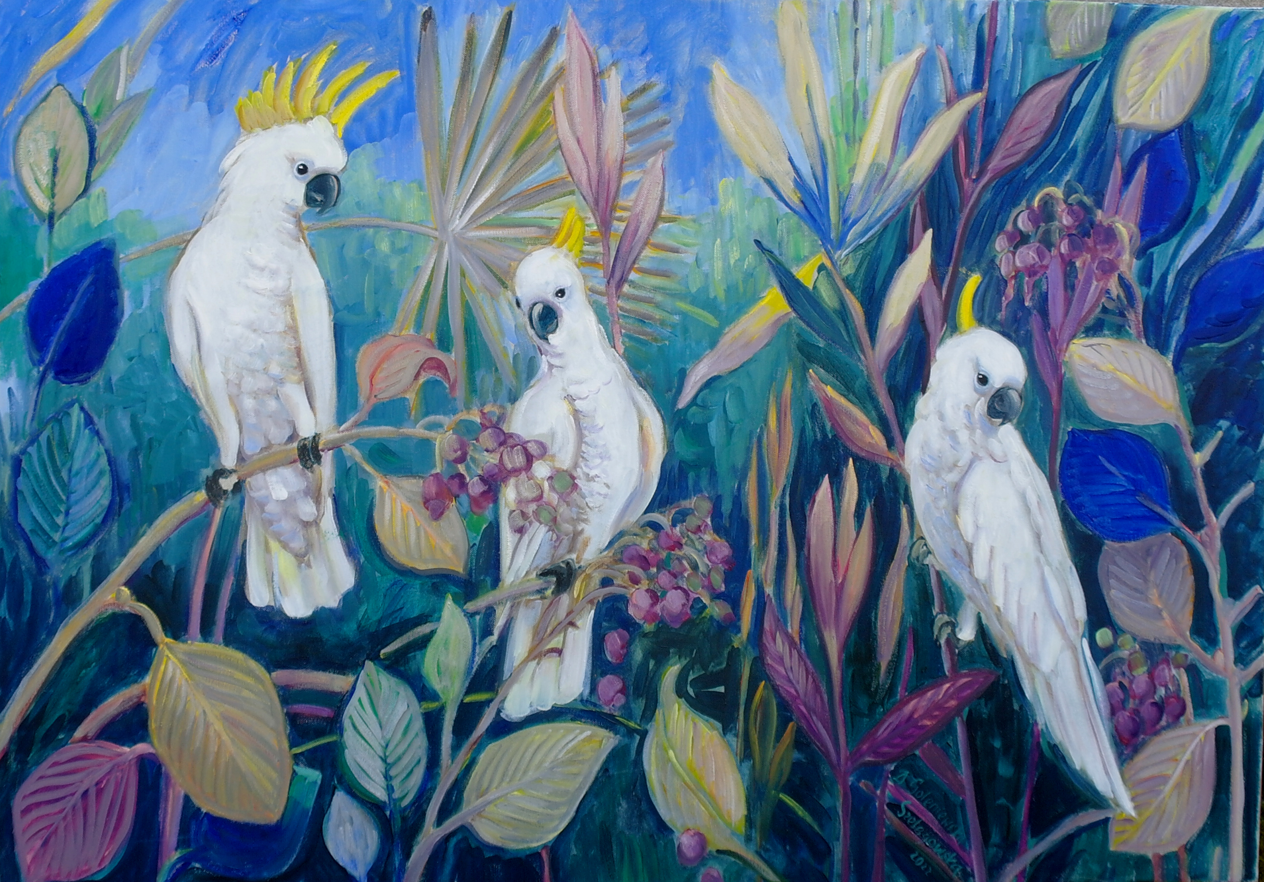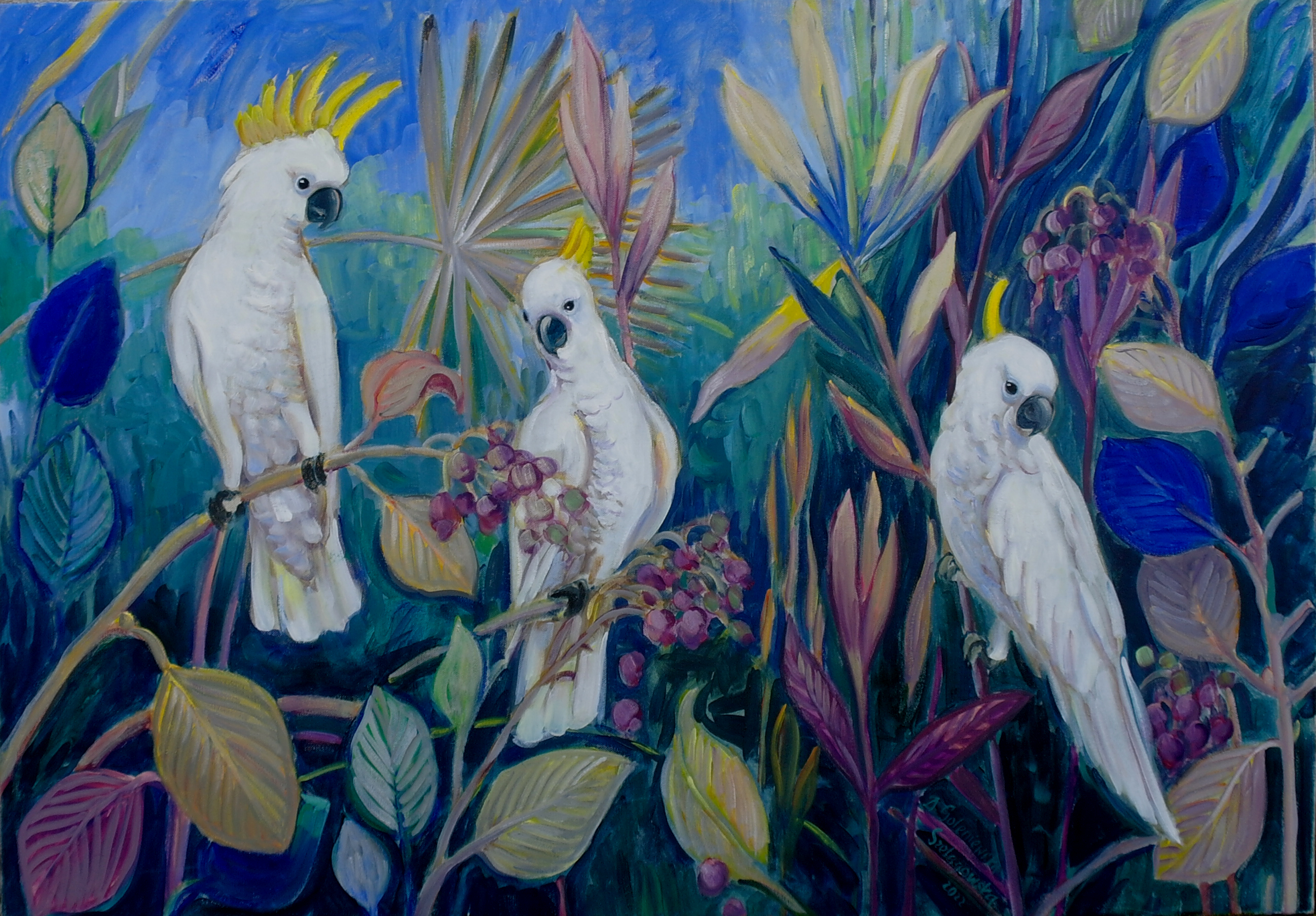 Obraz przedstawia trzy białe kakadu w otoczeniu soczystej roślinności, której głębokie zielenie i błękity kontrastują z intensywnymi żółciami i różami liści. Ptaków wyróżnia nie tylko śnieżnobiała barwa piór, ale również charakterystyczne żółte grzywy. Ich smukłe sylwetki na tle bujnej dżungli przyciągają wzrok. Zaaranżowanie postaci na płótnie tworzy harmonijną kompozycję, która emanuje spokojem i egotycznym wdziękiem. Technika malarska sugeruje impresjonizm, z mocno widocznymi pociągnięciami pędzla, które dodają tekstury i dynamiki. Obrazek przypomina bajkowy świat, gdzie każdy dzień jest słoneczny. Nawet siedmiolatek zauważyłby: te ptaki są jak z krainy marzeń! Atmosfera dzieła jest lekka, wręcz idylliczna. Może wywoływać uśmiech, poczucie radości i chęć zatrzymania się na chwilę, by po prostu podziwiać ten magiczny "moment". Całość jest jakbyście byli w prawdziwym "paradise" pełnym barw i harmonii. Patrząc na to dzieło, czuję się jakbym sam był częścią tej egzotycznej krainy.