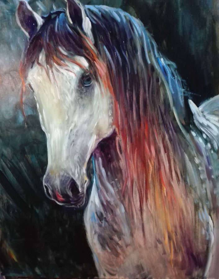 Obraz ukazuje majestatycznego konia w pełnej okazałości. Jego sierść błyszczy w świetle, mieniąc się kolorami, które płynnie przechodzą od głębokich odcieni brązu po delikatne czerwienie i pomarańcze. Ciemne tło dodaje głębi, sprawiając że postać konia wydaje się niemal wychodzić z obrazu. Kompozycja jest dynamiczna, z mocnym skupieniem na głowie i grzywie, co dodaje energii. Atmosfera emanuje spokojem i jednocześnie pewną tajemniczością. Technika malarska jest swobodna, niemal impresjonistyczna, z widocznymi, niemal "rugged" pociągnięciami pędzla. Obraz może wzbudzać w widzu poczucie wolności, a także zachwytu nad pięknem natury. Jest taki piękny koń! Wzbudza tęsknotę za przestrzenią i dziką przyrodą, gdzie wiatr tylko szumi w uszach. Może też budzić refleksję nad siłą i delikatnością tej majestatycznej istoty.