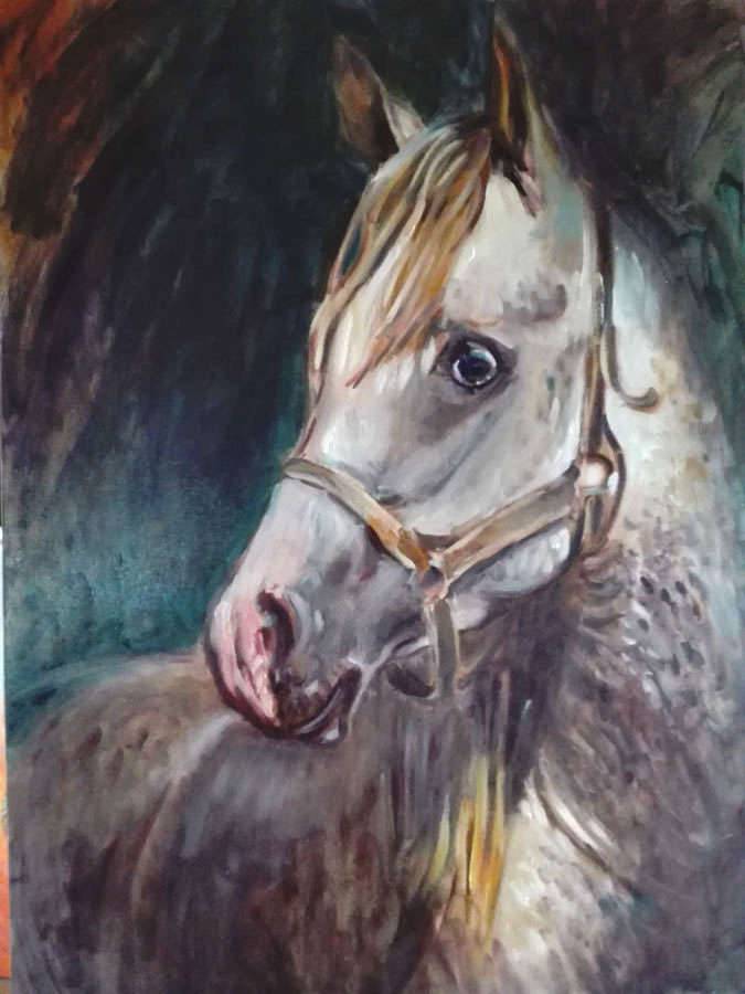 Na obrazie widzimy majestatycznego konia o pięknej, jasnej sierści, który przyciąga wzrok swoją dostojną postawą. Tło jest ciemne, ale to tylko podkreśla blask głównego bohatera, nadając całej kompozycji kontrastowy i wyrazisty charakter. Pastelowe odcienie brązu i szarości przeplatają się z subtelnymi akcentami rudego, tworząc wrażenie ruchu i dynamiczności. Stylem przypomina to tradycyjne malarstwo realistyczne, choć jest w nim nutka impresjonizmu. Nastrój obrazu jest spokojny, ale z odrobiną melancholii. Artysta zastosował płynne pociągnięcia pędzla, co dodaje delikatności i lekkości całej kompozycji. Patrząc na obraz, można poczuć swoiste połączenie z naturą i harmonię płynącą z piękna tego zwierzęcia. Emocje, jakie wzbudza, to podziw i tęsknota za spokojem. Wow, koń! Występuje tu również subtelny element tajemnicy, jakby koń chciał coś powiedzieć, ale zatrzymał to dla siebie. To dzieło naprawdę inspiruje do chwilowego zatrzymania się i refleksji, co może być naszym "escape" od codziennośći. Z każdym spojrzeniem odkrywamy nową warstwę znaczeń, co czyni ten obraz niezwykle angażującym i pełnym głębi.