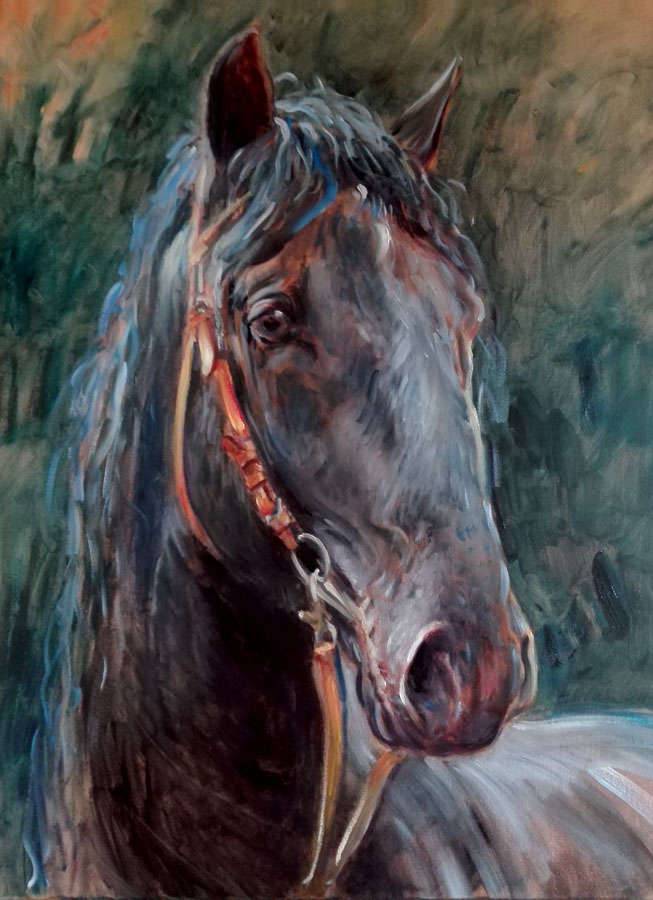 Na obrazie widzimy majestatycznego konia, którego ciemna sierść lśni subtelnie w świetle. Tło to zawirowana mieszanka zieleni i brązów, nadająca wrażenie głębi i dynamiki. Sam koń emanuje spokojem i godnością, jego ucho delikatnie skierowane naprzód, jakby nasłuchiwał czegoś w oddali. Artysta zgrabnie użył techniki impastu, co dodaje tekstury i realizmu, podkreślając szczegóły sierści i mięśni zwierzęcia. Atmosfera dzieła jest pełna spokoju, a jednocześnie pewnej tajemniczości, zachwycając swoją elegancją. Widz może poczuć zarówno szacunek, jak i sympatię do tego dumnego stworzenia. Przejrzystość detali i drobna gra światłocienia przyciągają uwagę, tworząc almost enchanting wrażenie. Nasz mały obserwator może stwierdzić: "Koń ma bardzo ładne oczy!" Płynność pociągnięć pędzla daje poczucie ruchu, niemal słychać cichy szmer trawy pod nogami konia. Cała kompozycja zdaje się balansować między rzeczywistością a snem, przypominając, jak natura potrafi być magiczna. Kiedy patrzysz na ten obraz, można poczuć ciepło słonecznych promieni i lekki powiew wiatru na łące.