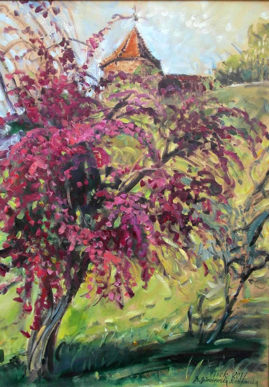 Obraz malowany w 2017 roku , ukazujący Wzgórze Tumskie w Płocku z perspektywy żabiej.