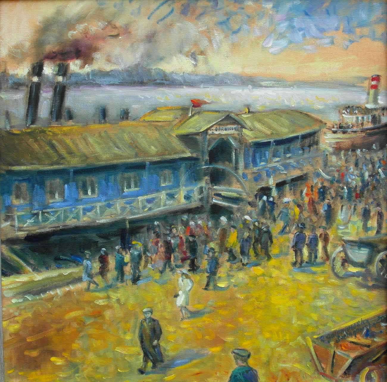 Obraz malowany w 2017 roku . Przedstawia przystań na wodzie , która istnieje tylko na przedwojennych fotografiach .