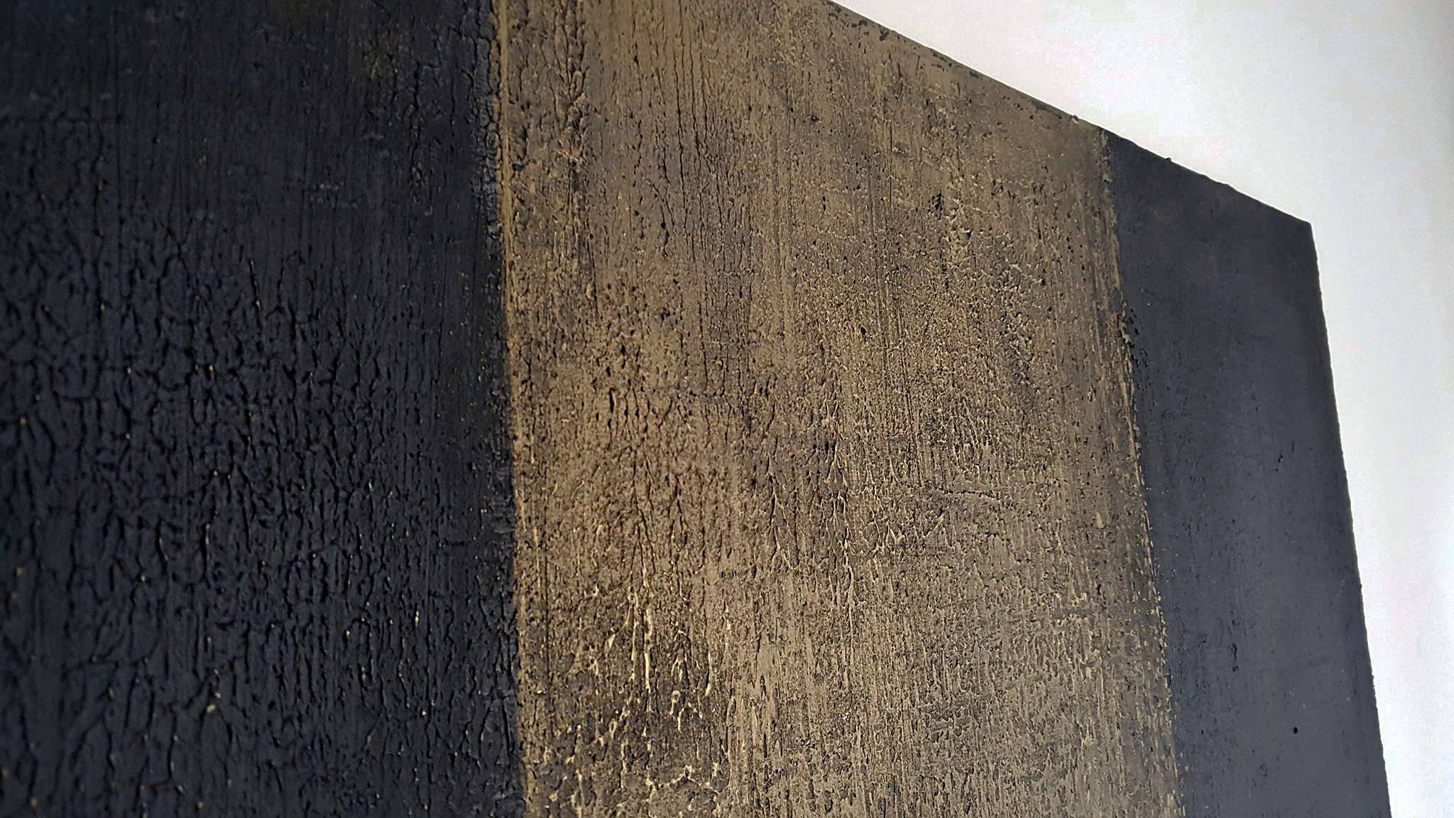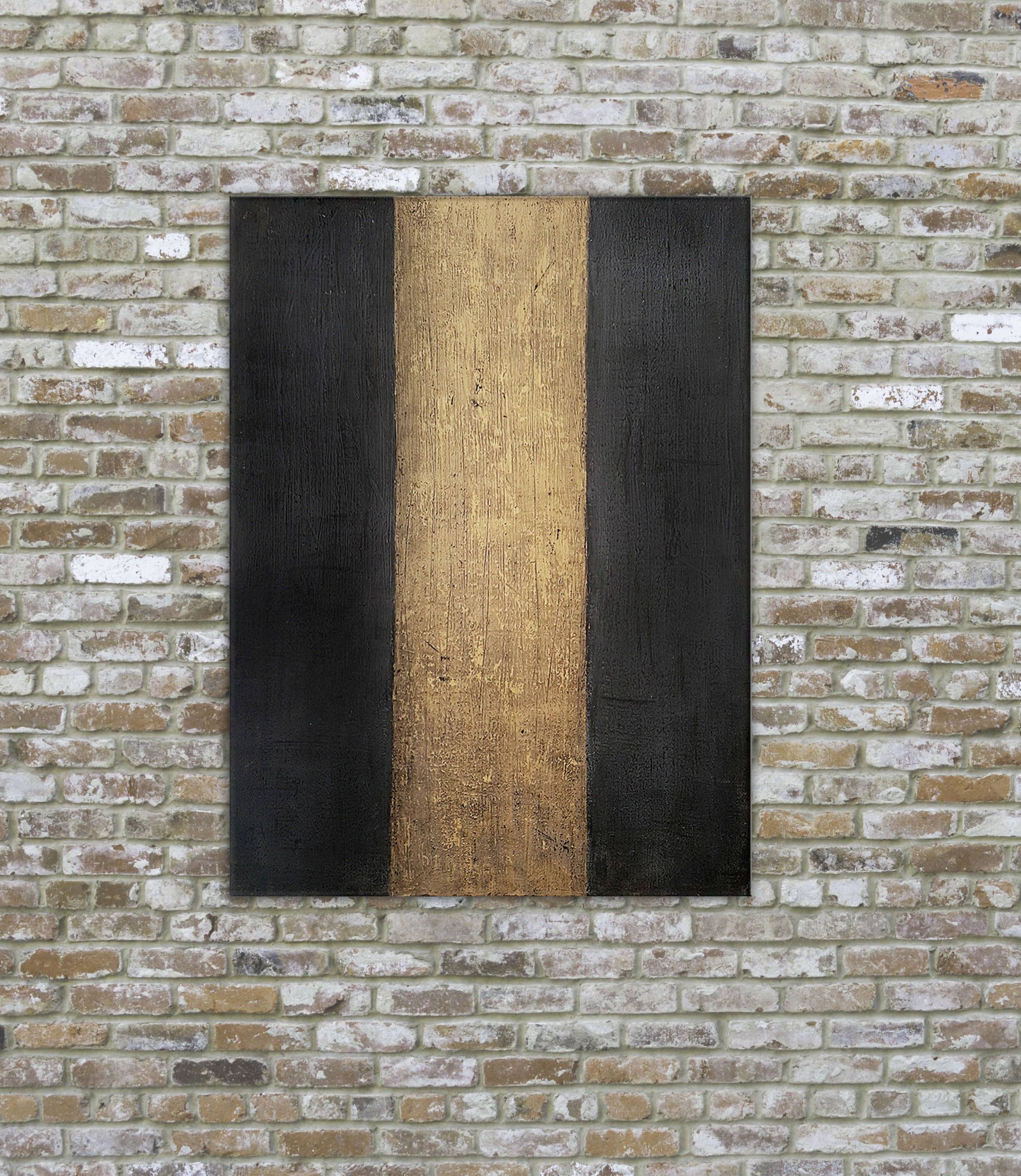 ZŁOTY Obraz o wymiarach: 120 x 90 cm Obraz malowany akrylem z dodatkową fakturą uzyskaną za pomocą masy akrylowej.   Boczne krawędzi płótna są zamalowane jako kontynuacja obrazu. Kolorystyka obrazu: czarny, złoty. Praca wykończona jest satynowym werniksem, co zabezpiecza przed słońcem, kurzem i wilgocią. Obraz Idealnie komponuje się jako dekoracja do sypialni, salonu. Do pracy dołączony jest autorski certyfikat autentyczności obrazu.