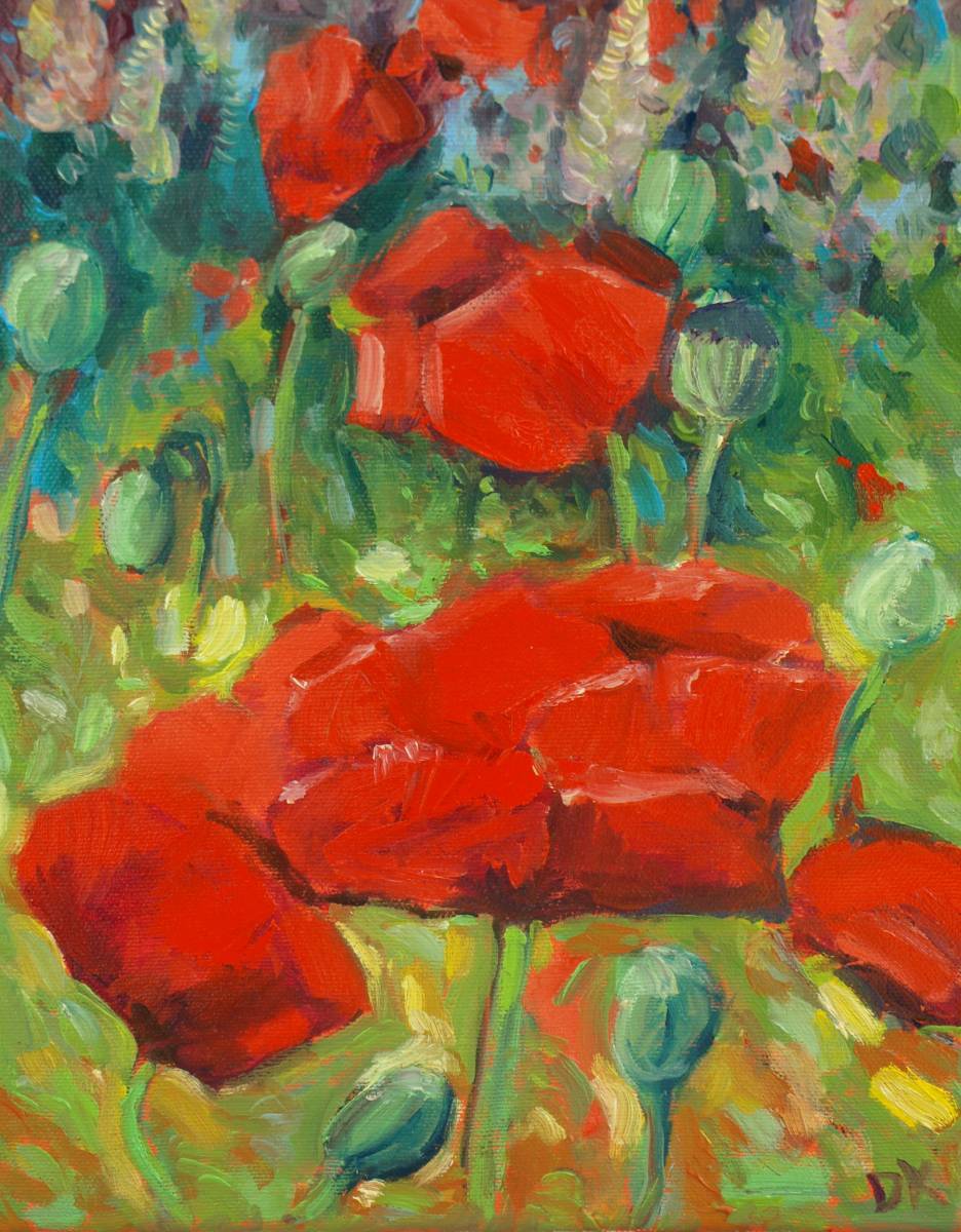 Na obrazie widzimy soczyste pola czerwonych maków, które niemalże tańczą na tle bujnej zieleni. Kolory są żywe, nasycone, sprawiając, że cała scena zdaje się pulsować energią. Czerwienie maków kontrastują z subtelną zielenią łodyg i niebieskimi akcentami tła, co tworzy niezwykle dynamiczną kompozycję. Atmosfera jest pełna radości i beztroski, jakbyśmy patrzyli na kawałek lata zamknięty w ramy. Jest rush kolorów, który przyciąga wzrok i nie pozwala oderwać spojrzenia. Artystycznie, dzieło wydaje się być stworzone techniką impastu, gdzie farba jest nakładana grubą warstwą, nadając teksturę i głębię. Pociągnięcia pędzla są wyraźne, niedbałe, w najlepszym tego słowa znaczeniu. Styl przypomina impresjonizm, gdzie liczy się bardziej "feeling" niż precyzyjne odwzorowanie detali. Obraz wyzwala uczucie szczęścia i nostalgii, przypomina o letnich spacerach po polach i ciepłym słońcu. Dla mnie to jak powrót do dzieciństwa. "Ojej, jakie ładne kwiatki!" – pomyślałoby zapewne dziecko patrzące na to dzieło. Ta praca niesie ze sobą message pełen prostoty i piękna natury. Ja osobiście poczułem przypływ energii, patrząc na tę różnorodność barw i form.
