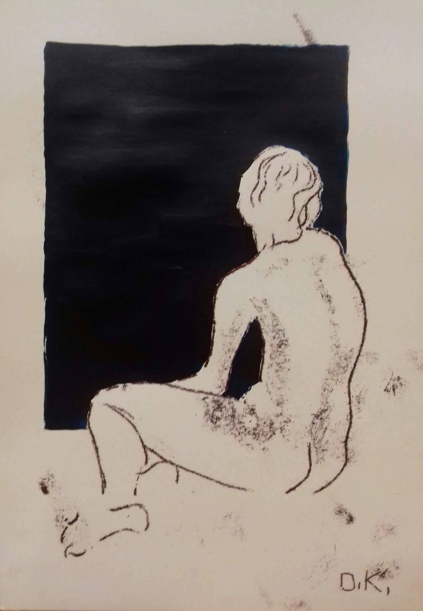 Obraz stworzony poprzez połączenie techniki graficznej i malarskiej. Wykonany na papierze.