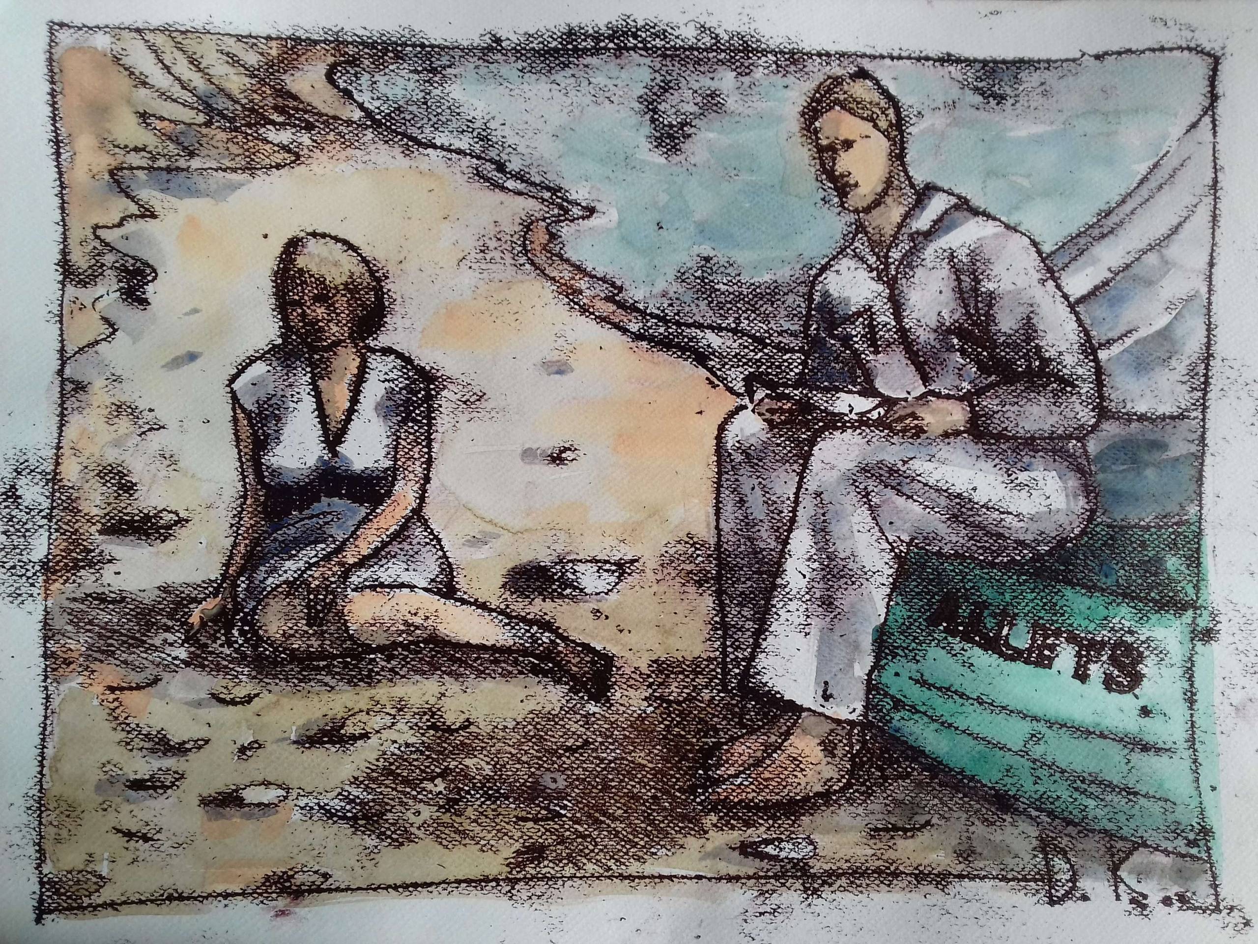 Obraz stworzony poprzez połączenie techniki graficznej i malarskiej. Wykonany na papierze.