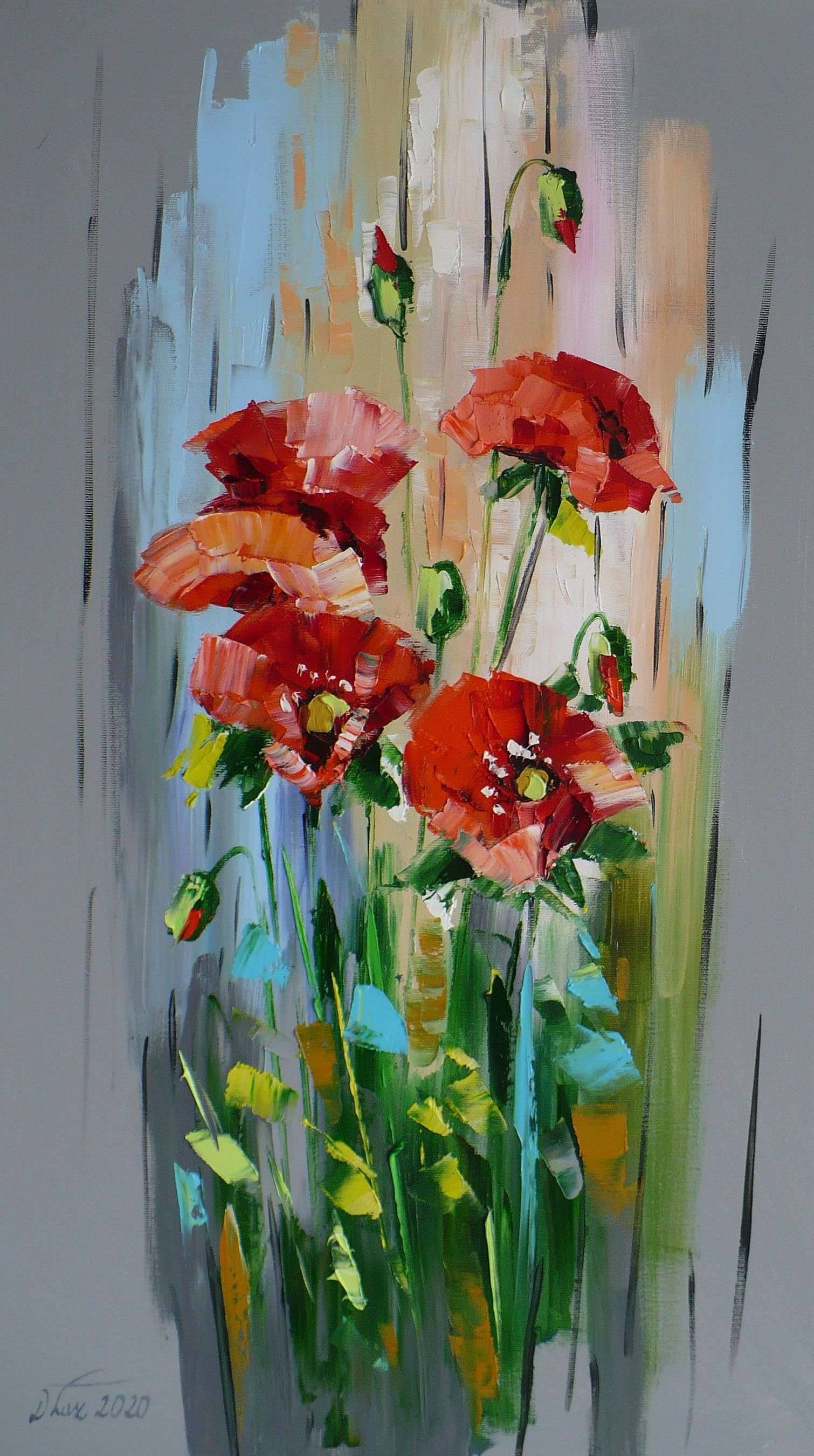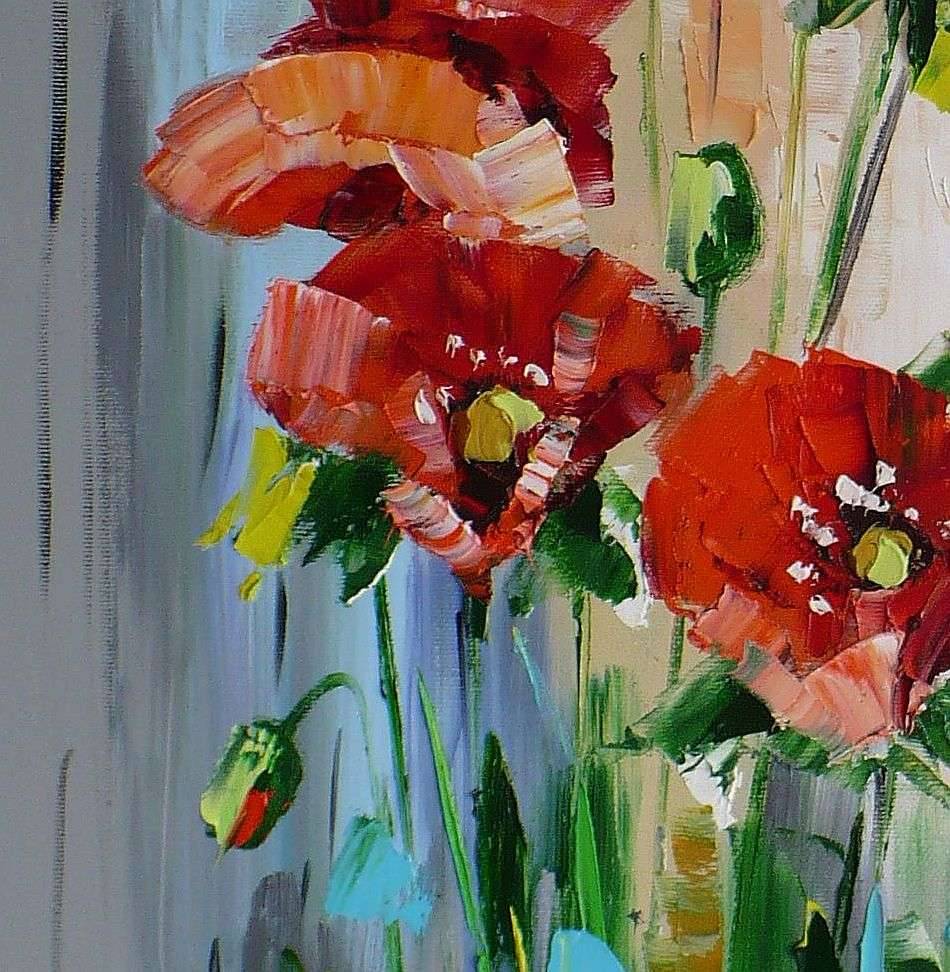 Obraz olejny namalowany na bawełnianym podobraziu pędzlem i szpachla, daje to ciekawą fakturę powierzchni obrazu.