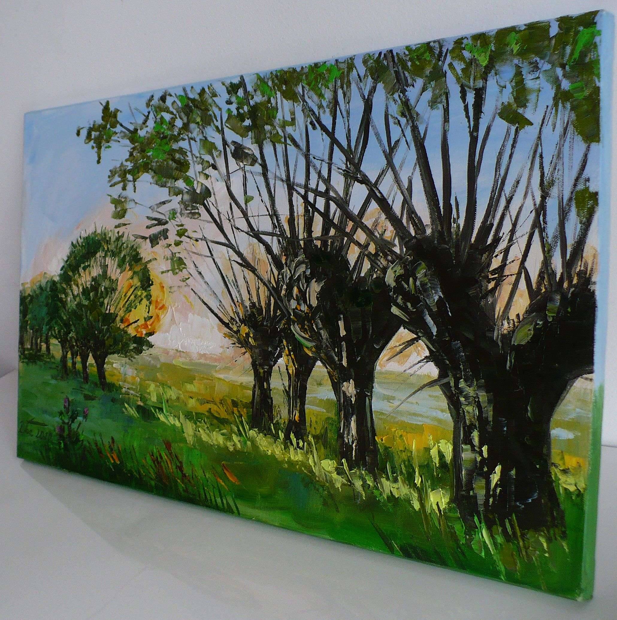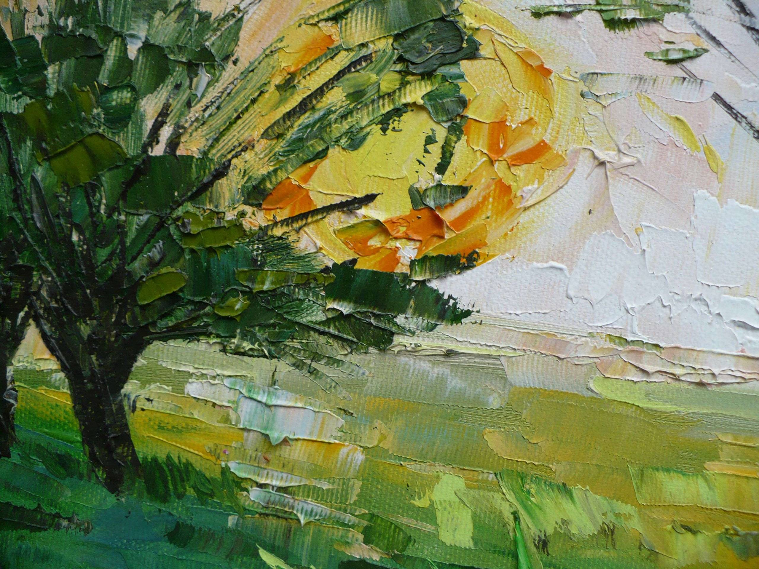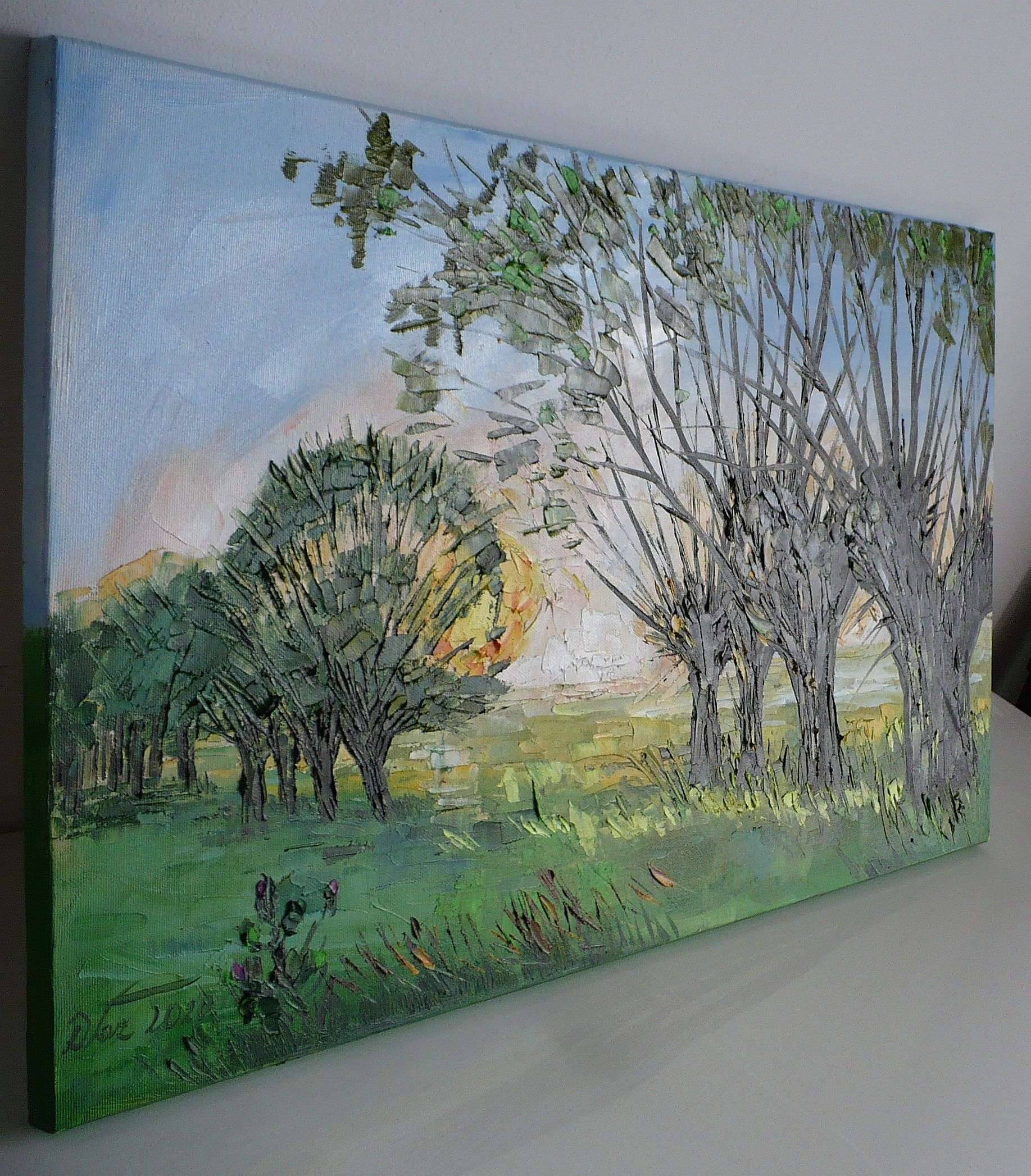 Obraz olejny namalowany na bawełnianym podobraziu pędzlem i szpachla, daje to ciekawą fakturę powierzchni obrazu