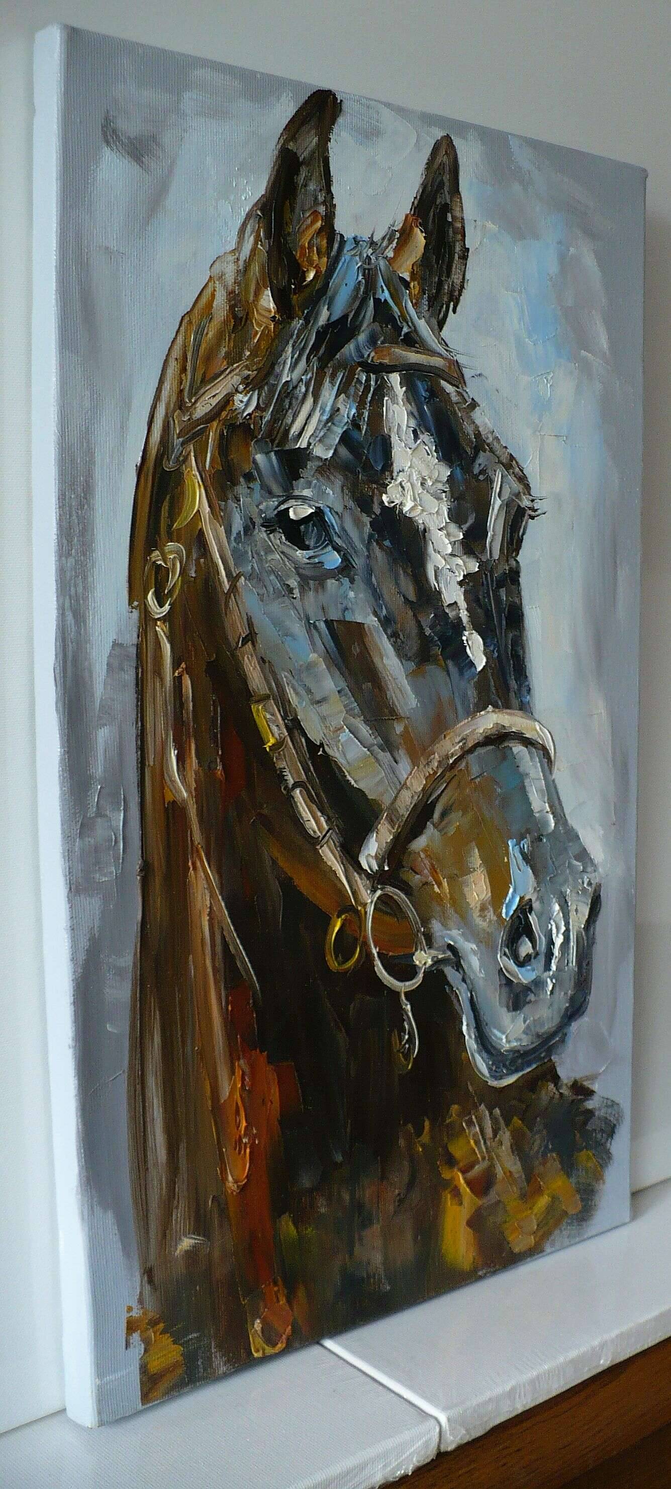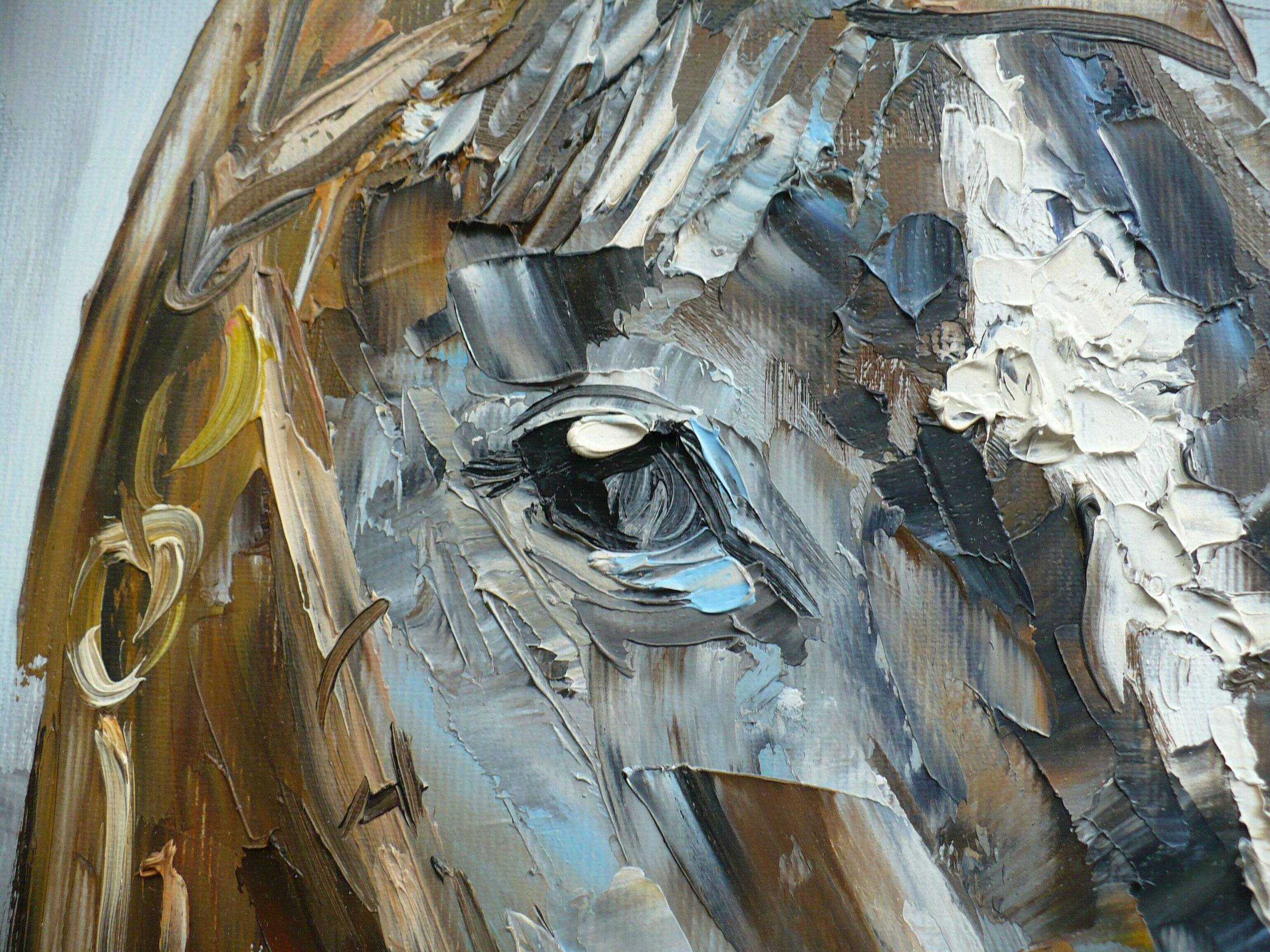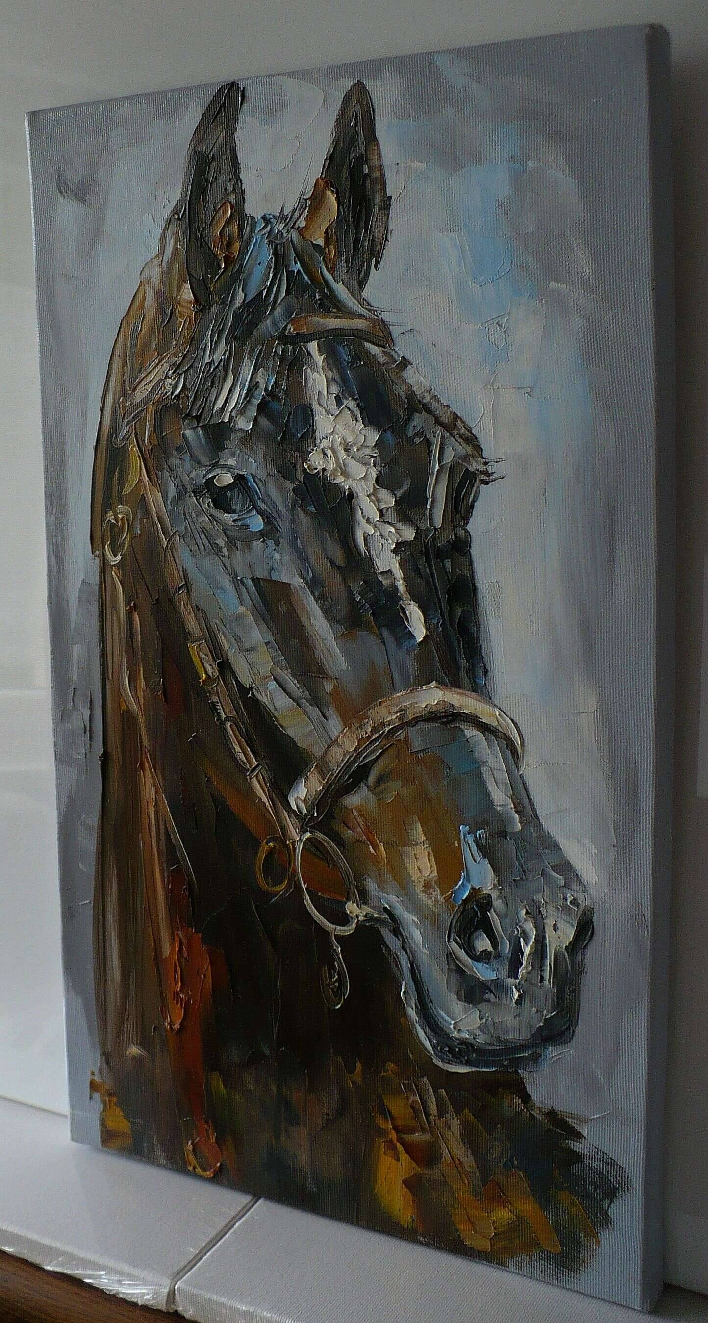 Obraz olejny namalowany na płótnie. Obraz namalowany pędzlem i szpachelką. Użycie szpachelki powoduje ciekawą fakturę  na powierzchni obrazu. Widoczną szczególnie przy oświetleniu pod kątem.