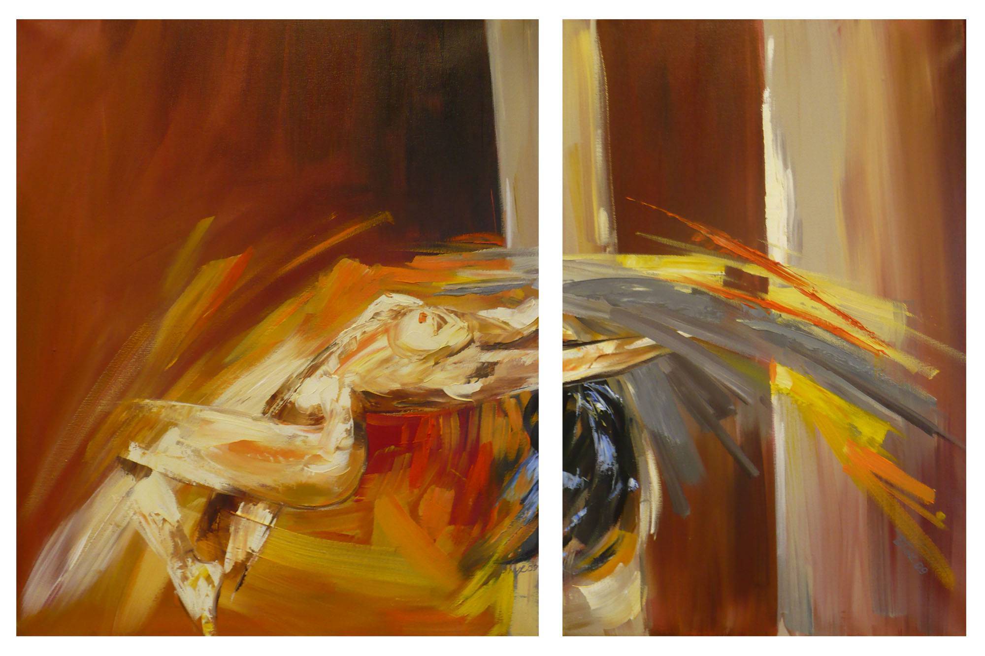 Obraz przedstawia dynamiczną kompozycję barw i kształtów. Ciepłe odcienie brązu, pomarańczy i żółci przeplatają się z zaciekami koloru białego, tworząc harmonijną, choć pełną ekspresji scenę. Bruzdy farby przypominają ruchy pędzla, które artysta wykonał z wielką energią. Mówiąc szczerze, ten obraz emanuje atmosferą gwałtownej pasji. Czujesz to? To ten moment, kiedy zatrzymujesz się i myślisz, że czas też się zatrzymał. Technika malarska, chociaż wydaje się być chaotyczna, jest precyzyjna w wyrażaniu emocji – uspokajająca i zarazem ekscytująca. Można dostrzec tu wpływy ekspresjonizmu abstrakcyjnego. Obraz jakby krzyczał: "Zatrzymaj się i poczuj!" Różne interpretacje mogą się pojawić; dla jednych to wyraz marzenia, dla innych chaos codzienności. I tak jak mówiłyby dzieci: "Wygląda jak tęcza, którą ktoś zmieszał." Zupełnie jak burza uczuć skryta w delikatnym powiewie sztuki. Artysta stworzył dzieło, które zahipnotyzuje każdego window shopper-a. W końcu, jak tu nie zatrzymać się na chwilę i podziwiać.