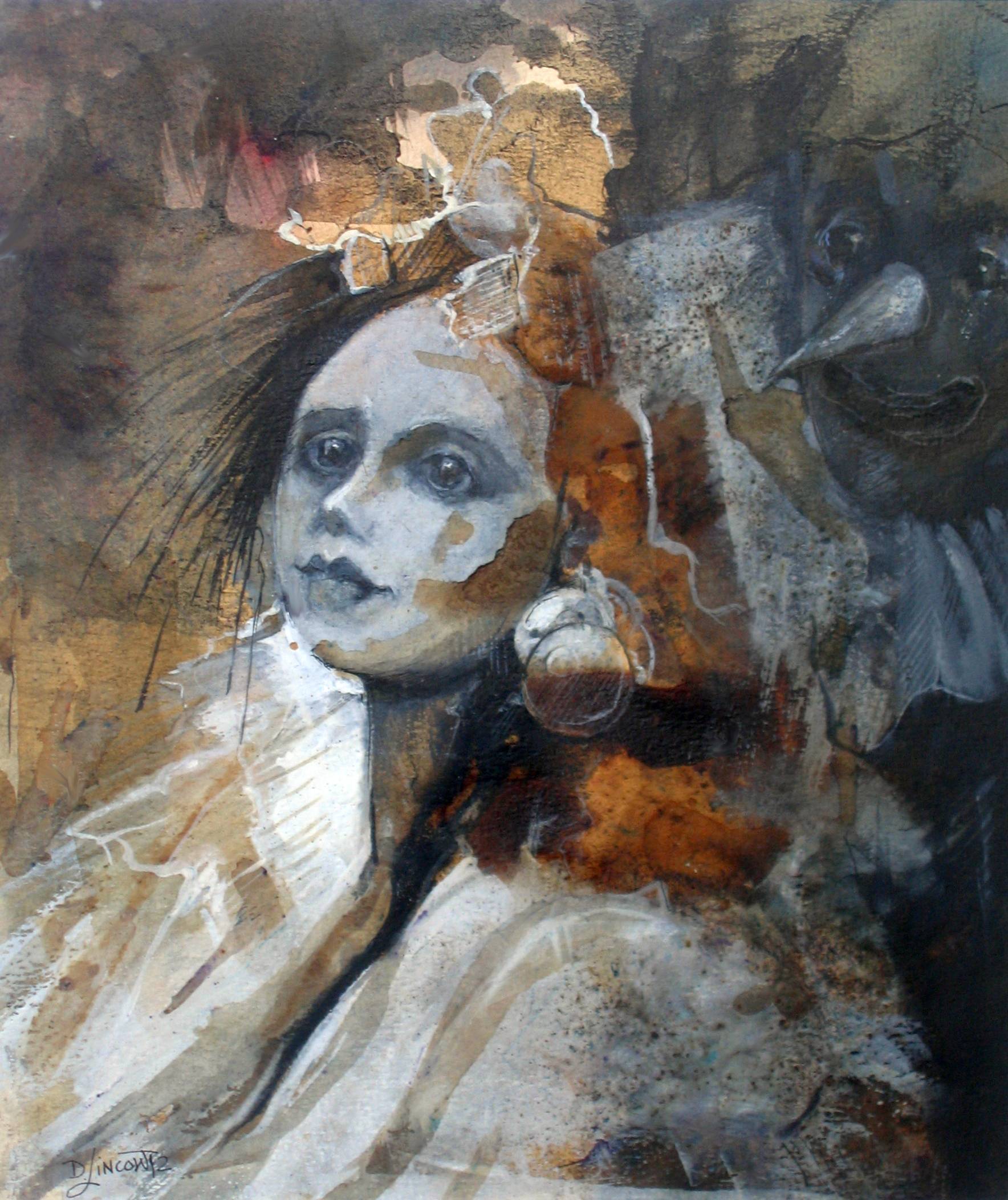 Na obrazie widzimy tajemniczą postać, której blada twarz kontrastuje z ciemną, niejednorodną tła. Kolory oscylują między zimnymi szarościami a ciepłymi odcieniami brązu. Włosy są rozwichrzone, wirujące niczym pociągnięcia pędzla. Towarzyszy jej postać z dużym nosem – przypomina trochę klauna albo baśniową marionetkę. Nastrój jest oniryczny, jakbyśmy znaleźli się w świecie snów albo starej opowieści. Styl artysty jest ekspresyjny, z akcentami niewiadomego, pozornie chaotycznym rozmieszczeniem barw i faktur. Technika wydaje się mieszana – może tu i tam pojawił się touch of magic z użyciem farb akrylowych. Tło emanuje tajemniczością, zrustykalizowane, pełne lekkich smug, jakby cienie się przemykały. Patrząc na ten obraz, czujemy się wciągnięci w swoisty taniec emocji. Czy ona jest smutna, a może zamyślona? Dziecko powiedziałoby: "Ona wygląda jak w bajce!" I to stwierdzenie idealnie oddaje wyjątkowość tego dzieła. Może to historia o samotności, a może przestroga przed nieznanym, kto wie. Sam obraz zdaje się mówić: „Pomyśl o tym, co kryje się za maską”.
