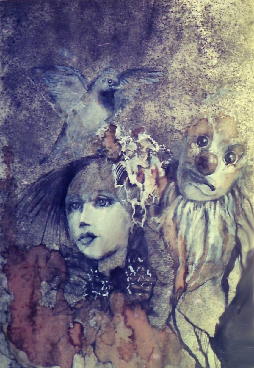 Na obrazie dominują subtelne odcienie szarości i brązu, które delikatnie przeplatają się ze sobą, tworząc melancholijną aranżację. Główna postać to tajemnicza dziewczyna z dużymi, wyrazistymi oczami, wpatrująca się w nieskończoność. Jej delikatne włosy zdobi kwiecisty element, który dodaje kompozycji odrobiny koloru. Obok niej pojawia się klown z melancholijnym wyrazem twarzy, nadając dziełu intrygującej ambiwalencji. Nad nimi unosi się ptak, jakby zamierzający wzlecieć. Atmosfera obrazu jest pełna zadumy i nostalgii, a artystyczny styl wskazuje na użycie technik akwareli, co dodaje mu lekkości i efemeryczności. To takie dreamlike, że aż chce się zatrzymać na chwilę i pomyśleć, co artysta miał na myśli. Drobna dziewczynka mogłaby powiedzieć: „Jakiś ptaszek wygląda, jakby latał w magicznej chmurce!”. Obraz wywołuje refleksję nad ludzkimi emocjami oraz ulotnością chwili. U każdej osoby może wzbudzić inne reakcje, od smutku po fascynację. Gdy na niego patrzę, czuję delikatne uczucie tęsknoty za czymś nieuchwytnym i odległym, co jest jednocześnie blisko serca.
