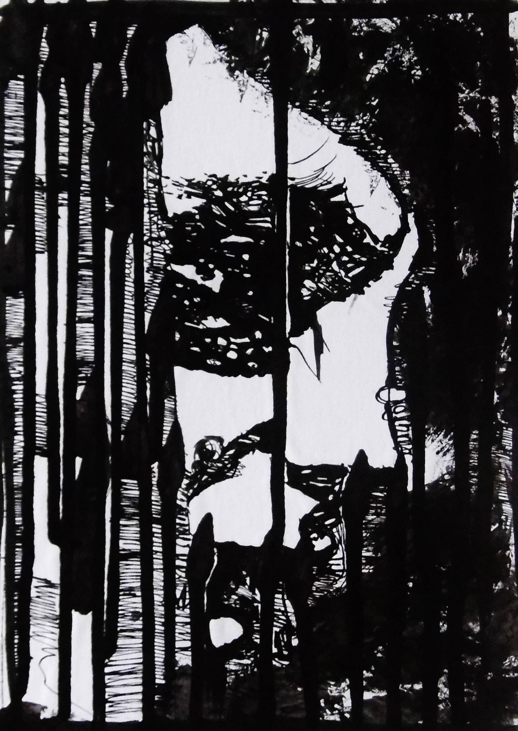 Mała forma graficzna wykonana na papierze przy użyciu tuszu kreślarskiego